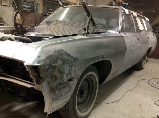wall and build a system for evacuating the dust too. The drivers side is done when it comes to paint stripping. Most is sanded down to the bare metal, and finished with 180 grit for perfect paint adhesion without risk of shrinkage into the gritgrooves. http://www.waasadata.com/belair/img/belair034.jpg The front fender is dented, and this will be adressed before the epoxy goes on. The severely dented, shrunk and hammered hood is also ready for epoxy. http://www.waasadata.com/belair/img/belair036.jpg I'm assuming a lot of filler will have to be used in order to make the hood look like it's supposed to... Detail work is done according to inspiration. My aim to make the wagon look a bit nicer than just your usual respray, so details like nice paint inside the filler door feels important. The chrome is pretty much shot on this car, but I hope to be able make it look tidy anyway. http://www.waasadata.com/belair/img/belair035.jpg |