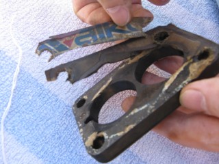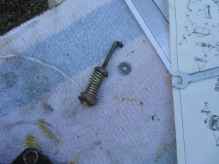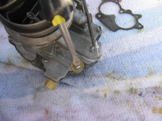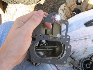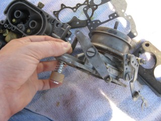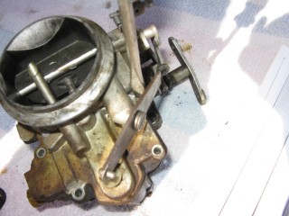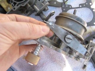 http://windypix.com/?dm=8R70.jpg Then hook the little spring on the back up and run the screw through it. Don't tighten it. http://windypix.com/?dm=E3XK.jpg Here's a side view so you can see. You need to make sure the wrench shaped linkage is hanging on the screw you just ran in, not butted up to the carb. THEN start screwing it down. It should move freely once you get it screwed down. http://windypix.com/?dm=JTLZ.jpg Put the link that looks like an "S" through the bottom part http://windypix.com/?dm=E84T.jpg Then the top. http://windypix.com/?dm=TTL6.jpg And cotter key them both. http://windypix.com/?dm=HZM8.jpg Now find a gasket to fit the bottom of "the bottom plate". This one obviously belongs in an art bucket at a pre-school. It doesn't fit. I have to say that for legal reasons so you don't try to use it and cause a thermo-nuclear reaction in your intake manifold. http://windypix.com/?dm=NB3B.jpg |