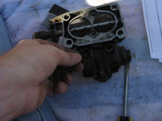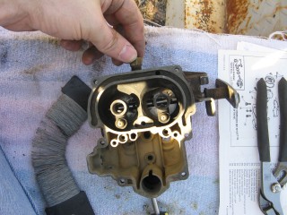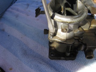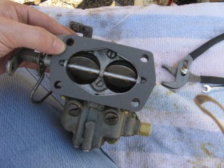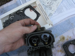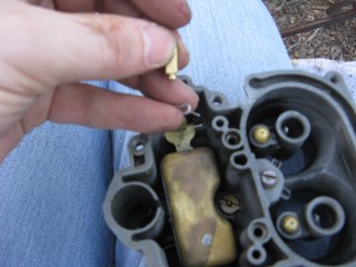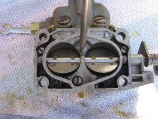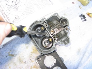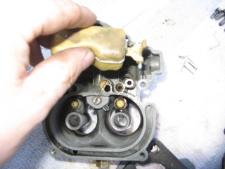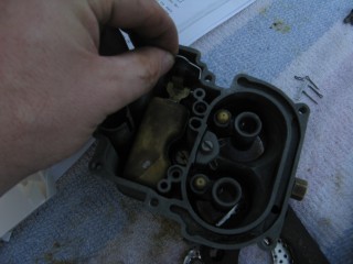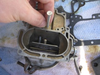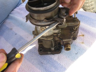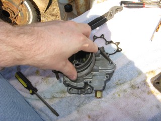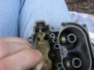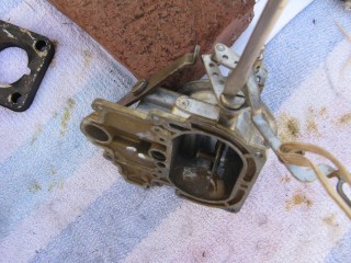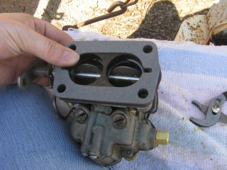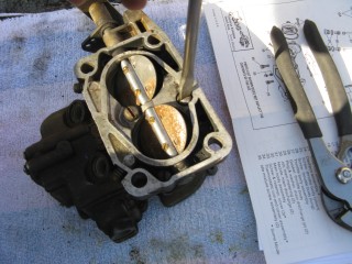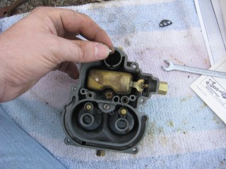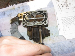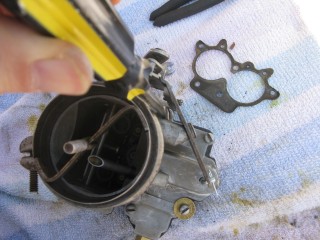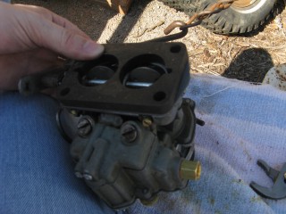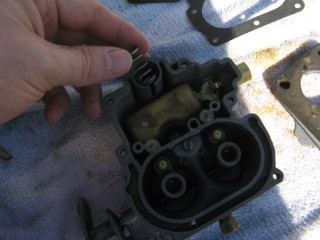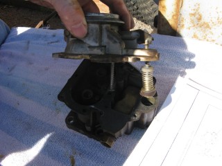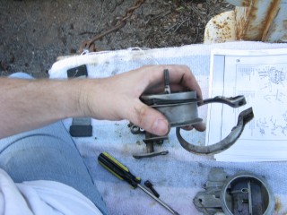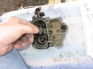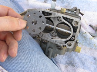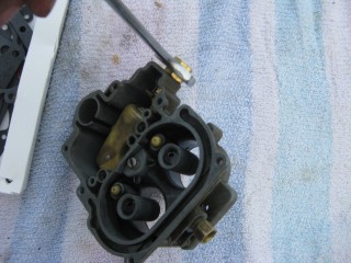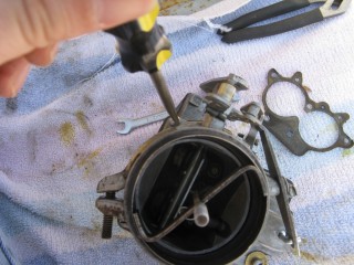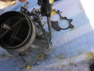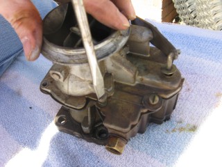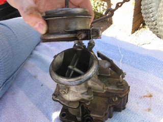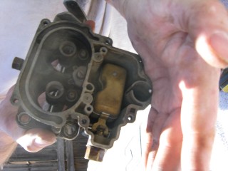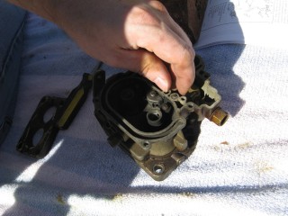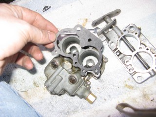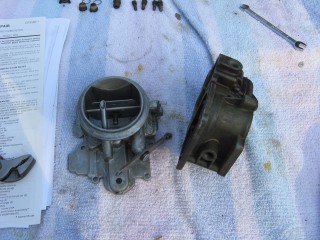 Then look at what's left. You have three main parts of the carb standing in front of you. The air horn on top, then the main body and finally the bottom part, which I forget the name of right now. We'll call it "the bottom plate" for now. My helper said we should just call it "Bob".