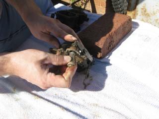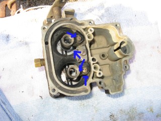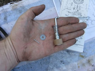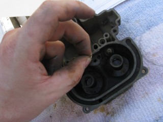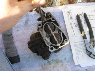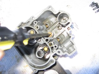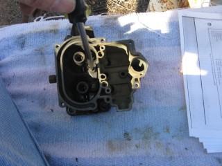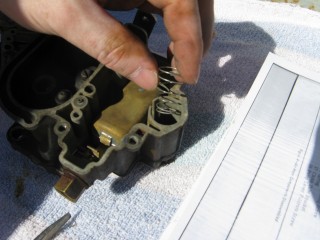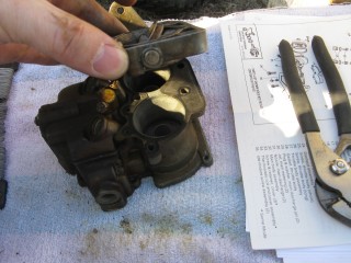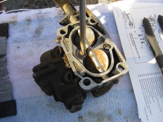 Remove the screws connecting the air horn to the main body. They're located here: http://windypix.com/?dm=10R0.jpg and here. This one also releases the brace that the throttle cable connected to. Don't lose them, store them together. http://windypix.com/?dm=XD2L.jpg Then here... http://windypix.com/?dm=0U6B.jpg And here... http://windypix.com/?dm=BOKL.jpg on to here... http://windypix.com/?dm=PVQR.jpg Then here, and this one's kinda hidden so pay attention :) http://windypix.com/?dm=E1QG.jpg There are two long springy plungers under the main body so as you pick it up be careful to come out pretty straight and hold it over something like my awesomely manly pink and turquoise towel (mentioned earlier). You never know when stuff will fall out. If it does, don't sweat. We'll show you where it goes later. Lift the air horn off of the main body. http://windypix.com/?dm=UAOX.jpg Be careful with the next portion. There's a little BB (yes, like you'd shoot in a BB gun) rolling around in two parts of the carb. The first part is right under this spring, which you might need to fish out with a screwdriver. http://windypix.com/?dm=PD56.jpg Now pour out the BB into your hand slowly so it doesn't jump out and run off. http://windypix.com/?dm=CNA2.jpg Here's a pic of everything we have done so far, with screws in the order they were removed, left to right... http://windypix.com/?dm=OKL6.jpg Here it started getting HOT under that boiling sun. We had to set up a little tent shade from Cecilia's cover. It worked OK for the time being. http://windypix.com/?dm=D5FS.jpg Our shelter set up, we continued by removing these little needles. There are two of them. http://windypix.com/?dm=LG0J.jpg Now remove the cotter pin from the pump piston if you have one on it. Mine didn't. Say it with me now....Gremlins! http://windypix.com/?dm=K90N.jpg Mine also had a washer on the top of it with a spring poking through the hole. I'm 99% sure that was NOT factory rigging. When we rebuild we'll leave both the spring and the extra washer off. It's not pictured in my manual at all. Unless that breaks something. Then we'll just make it ugly again. http://windypix.com/?dm=DIXV.jpg Here my expensive internet downloaded carb manual said to - and I kid you not - take a block of wood and a small wrench to pry out the vacuum piston pump (the second springy thing, located in the center of the carb). I thought, well that's weird. But if you say so... My vacuum piston was stamped in and no amount of gently tugging would pull it loose. So I obliged it as directed and sent the top flying off into the sunset. DO NOT DO THIS, though it made a beautiful SPROING noise. I found out later you don't even need to remove the vacuum piston as there isn't anything you need to replace in there. UGH. http://windypix.com/?dm=1ZAS.jpg Oh, and of course you can't buy this part for anything. Instead I had to get a magnet and fish the yard for the cap then I JB Welded it back together. It'll disintegrate over time in the gas but I plan to replace it anyway so no sweat there. It just has to work for a few weeks. Anyway, lesson learned. Fun stuff keeps the boredom away, right? :D So moving on, we remove this big screw holding the throttle cable connections. Be careful though, there's a tiny spring on the back of the connections (shown below) http://windypix.com/?dm=PTY9.jpg http://windypix.com/?dm=N07E.jpg You only need to unhook one side of the spring, the side that hooks to the carb. The other side should be stuck on due to a pinch in the linkage. Just gently remove the whole thing and set it aside. We'll dip the entire thing as a family project. Next remove the brass fitting on the outside of the carb where the gas went in. My photographer had a potty/lunch break and took my camera so no pix. It's pretty easy though. Just unscrew it with a wrench and pull out the little rocketship looking pin inside by unhooking it from the float with a screwdriver. Then use the same screwdriver to unhitch the metal pin on the float side of the carb holding the back of the float in. It'll spring off by itself if you're not careful so put a hand over it as you pop it loose. Then remove the float and it's little pin that holds it in place. Here's a pic of the stuff we've removed so far, in order from left to right, in rows top to bottom. http://windypix.com/?dm=50KC.jpg Now find some small wire to clean out the pins. Don't laugh, I have some of the wife's flower arrangement wire here. It works. Shut up. :P http://windypix.com/?dm=ARAR.jpg There are four more holes to clear while you're at it. The two inner ones are inside the smooth walls. You might have to hunt around for them. The outer ones are the big boobie looking nubs sticking up. http://windypix.com/?dm=LJJI.jpg Now grab the trusty screwdriver again and remove this center piece. There is another even smaller BB under this so be careful. http://windypix.com/?dm=JZ6T.jpg Again, be careful when you remove it...There's another BB under it. http://windypix.com/?dm=0X13.jpg Then pour out the little BB inside. http://windypix.com/?dm=3P7U.jpg Now flip the whole thing over and take off the bottom big screws. These cover your jets. We won't be removing the jets this time but we will clean them out with the wire. Removal is unnecessary. http://windypix.com/?dm=4PFM.jpg Under those big screws is two very dirty, probably invisible copper washers. Remove them and set them aside in case your new ones break when installing. Then clean the jets inside with the wire. http://windypix.com/?dm=MHXZ.jpg Now remove the vacuum brass fitting on the outside of the carb. http://windypix.com/?dm=NBDI.jpg Now we begin removing the four little screws on the very bottom. These hold on "the bottom plate", or Bob if you prefer. They're located here... http://windypix.com/?dm=2XYI.jpg And here http://windypix.com/?dm=8FLN.jpg And here... http://windypix.com/?dm=7AN0.jpg And finally here. http://windypix.com/?dm=E7FR.jpg |