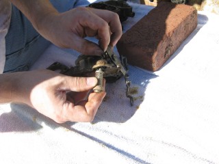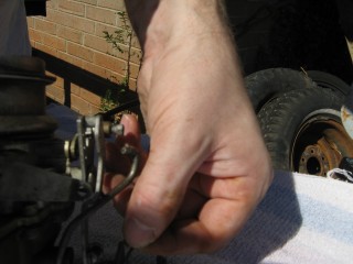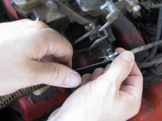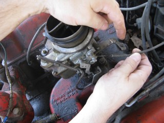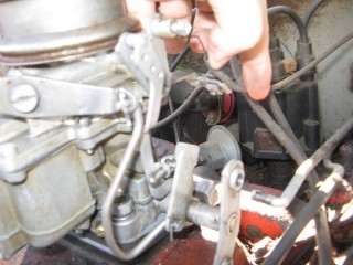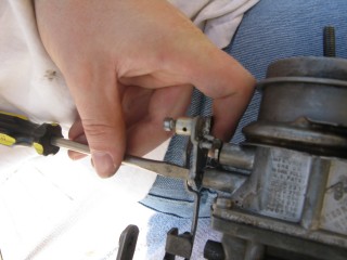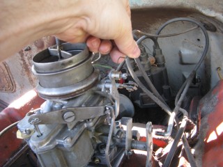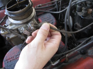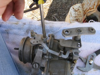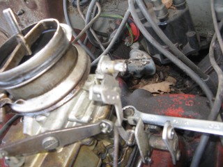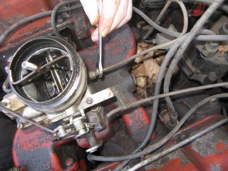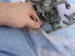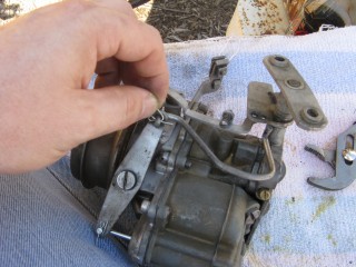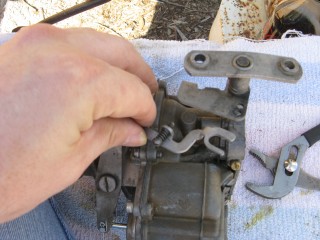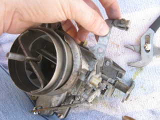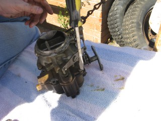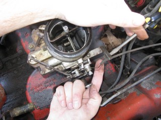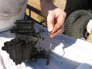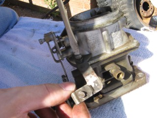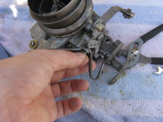 Grab your wrench looking piece of linkage and hook the wrench portion on the bottom of the carb.