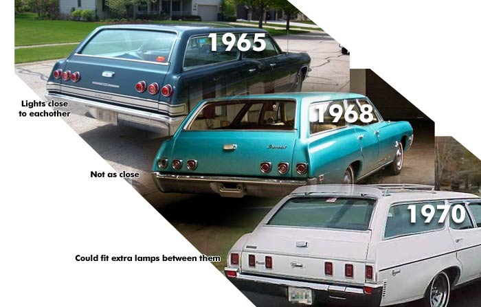 about the tail lights? I always liked the way the tail light are close to eachother to Chevrolets from 1965 and older. When Chevrolet came back to separate lights in 1968, they put them farther away from eachother. On the Kingswood this was further exaggerated. This is illustrated in this pic: http://www.waasadata.com/belair/img/belair016.jpg My wagon has been hit in the rear left corner, and the tail light lenses are all in dire need of getting changed for new ones. It's not really easy to find tail light lenses for the 1968 wagon, so I came up with the idea of costomizing my ride by mounting three pairs of 1950 Pontiac tail lights with sequential turn signals. Ever since I was a kid, I have dreamed of having that kind of turn signals on my car. This would also let me tuck the tail lights a little bit closer to eachother, than they're originally on an impala or caprice wagon. I tried to photoshop Pontiac lights onto the tail of a '68 wagon, and I think this would look so okay, that people who don't know classic cars probably wouldn't notice that it's not an original look. http://www.waasadata.com/belair/img/belair014.jpg Yup, I pasted in my own register plate too . |