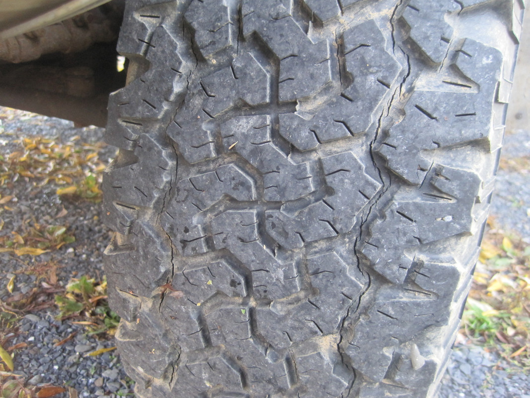 Cadillac Al, dang, that is some impressive cracking in the tread. Any idea how old those tires are? My friend has a similar set of bfg's. About 15 years old, lots of tread, but lots of those cracks in between the tread too.