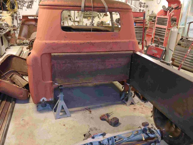We dropped the cab onto the frame to check placement and ride height. Because of the shape of the fender cutout, as you lower the ride height the wheel needs to move forward to look centered. You can see what I"m referring to in this photo. https://i.postimg.cc/zXmvqrDg/IMG-2185.jpg But, because we are making a custom bed I think we can move the cab back a touch to center the wheel. Then we can place the rear fenders where we want them on the bedsides and just shorten the steps as needed. So, for anyone reading along, Jason56 is correct. 113" wheel base will be short if you are planing to use stock bed sides. |
