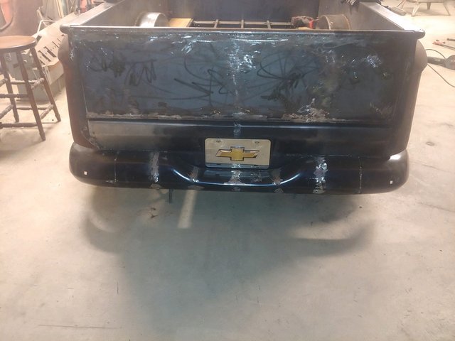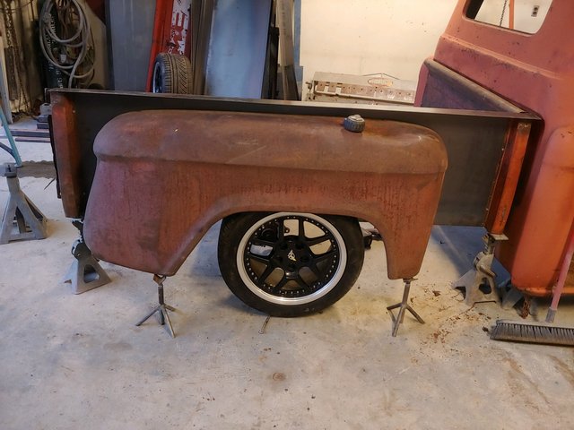 Rolled some custom mini-tubs and got those installed. 4" was enough to give me 1" of clearance on the back side of the wheel. I didn't end up narrowing the corvette rear end so I am running the stock offset wheels. I haven't picked out the final wheels for this build. Hopefully I didn't limit myself too much with this offset. Got my new tailgate built and placed where I like it. Also mocked up the bumper I bought. It is going to need some work to get it to look good on there. I was a bit surprised to see that was curved like the front bumper. Looks like they were from the same stamp except for the license plate notch. Not sure if I bought the wrong part or if this is how they are. The truck didn't have a rear bumper on it when I bought it. I guess I'm going to have to cut it up and straighten it out. Luckily I didn't spring for the chromed bumper because I figured it would need some work to get it to fit right. https://i.postimg.cc/cCMtsZbj/88-E93...-C65-F4-ED.jpg Got the steps tacked back together as well. https://i.postimg.cc/J0WBVtPZ/170-B8...C06496-CDF.jpg Something about that detail that just ties the whole truck together and makes things feel more connected. |