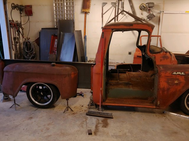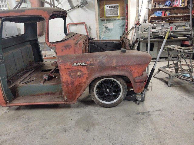 Long time listener. First time caller. I really enjoy reading through the build threads on here and wanted to try my hand at writing one for a change. The Intro It all started when I dragged this little heap home. She has been [strike] rotting [/strike] sitting patiently in the yard waiting for things to fall into place. Three years later, her time has come. https://i.postimg.cc/nzvR4jWP/1-B1-A...AF54466-E9.jpg The Truck The title says it is a 1955 long bed GMC 100. From the looks of it she got a '57 nose job somewhere along the way. It's not in the best of shape by any means, but it is mostly complete and should suit my needs pretty well. https://i.postimg.cc/L8XbcsqJ/049-DA...46-BD64-C2.jpg https://i.postimg.cc/WbsK78T6/4-A792...-BFC8-E060.jpg https://i.postimg.cc/J0LFvcJ8/2-B9-E...-F40-F05-A.jpg https://i.postimg.cc/wBnZcdj7/30153-...1-EA0-DF23.jpg https://i.postimg.cc/8CfnCnmD/A9-F94...551-C861-E.jpg The Story Growing up, my neighbor used to build some of the coolest cars in town. He worked full time at the pipe factory down the street. After work he would spend all night hand shaping sheet metal, porting cylinder heads, and calculating chassis geometry in his little one car detached garage. I would always pester him to see what he was working on and was amazed at the passion he had for the craft. The junk he would drag in there was almost unrecognizable when he was done. I remember an f100 he found out in a field that had a tree growing through the cab. He went out there with his chainsaw, chopped down the tree and drug that rusted carcass of a truck home. Another time he found a split bumper Camaro that an old barn had collapsed on. He tore down and hauled away the barn then proceeded to dig what was left of the car out of the mud pit that was left behind. When everyone else saw a lost cause he saw opportunity. I really admired that and it is something that has stuck with me to this day. For years I have been trying to talk him into helping me with a build. Besides the obvious cool factor of driving a custom truck, but also the sentimental value of having a little piece of a childhood fantasy come true. TLDR I'm building a truck with the help of a couple of old friends. The Plan A custom tube chassis c4 suspension and drivetrain. Fuel injected Lt1 Manual trans Dana 44 with 4.10 Gears Ididit steering column Dakota digital gauges Custom bed and tailgate Vintage air kit Under bed gas tank Bucket seats The Goal I did a quick comp of what it looks like in my head. https://i.postimg.cc/tCNvcx2d/18-F08...25-F087-CF.jpg Got a long way to go... :lol: Let's get to building. |