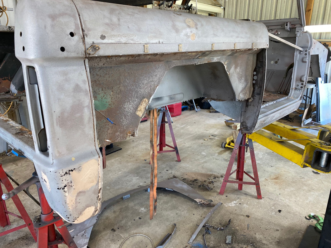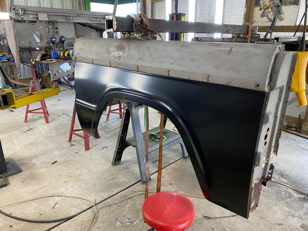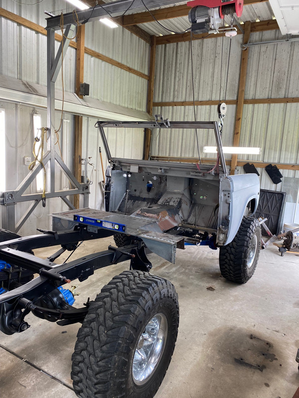 I've since welded this into place, I have some more patches to do, but it's looking ok. https://i.postimg.cc/FzxNVtxq/Bronco-floor.jpg I finally decided to put the cab on the frame, just was having problems supporting the cab/bed. I just need to weld in the floor support as there isn't one on the passenger side, that's where my crane is holding up that side. https://i.postimg.cc/ZqYJDNps/Bronco_body_on_frame.jpg Just a glamour shot of the right front fender;) https://i.postimg.cc/7YmqCkhJ/Bronco-body-on-frameb.jpg Engine compartment less engine, inner fenders; there's no body supports in the very front yet; need to put the whole thing together to see how it aligns. https://i.postimg.cc/Y2NrHgw3/Bronco-body-on-framed.jpg I'll get to this bed someday, focusing on the cab for now. https://i.postimg.cc/Wb22b3NP/Bronco-body-on-framec.jpg Others: on Fbmarket place, I found a new drivers door shell (Dyna) for 150;) I'm in no hurry, having a good time getting out there, even if to sit in a lawn chair and enjoy the moment;) |