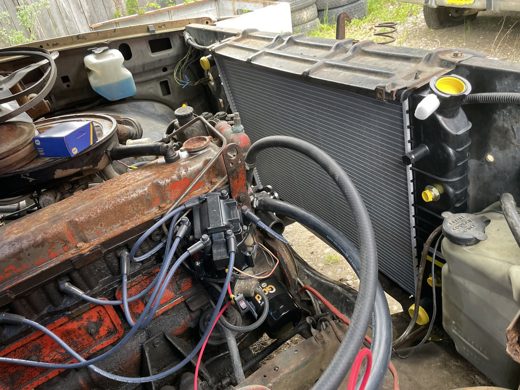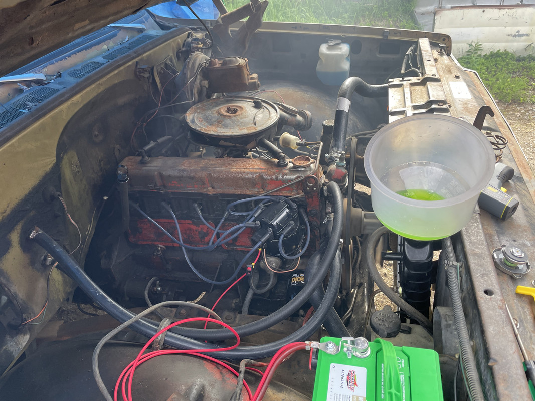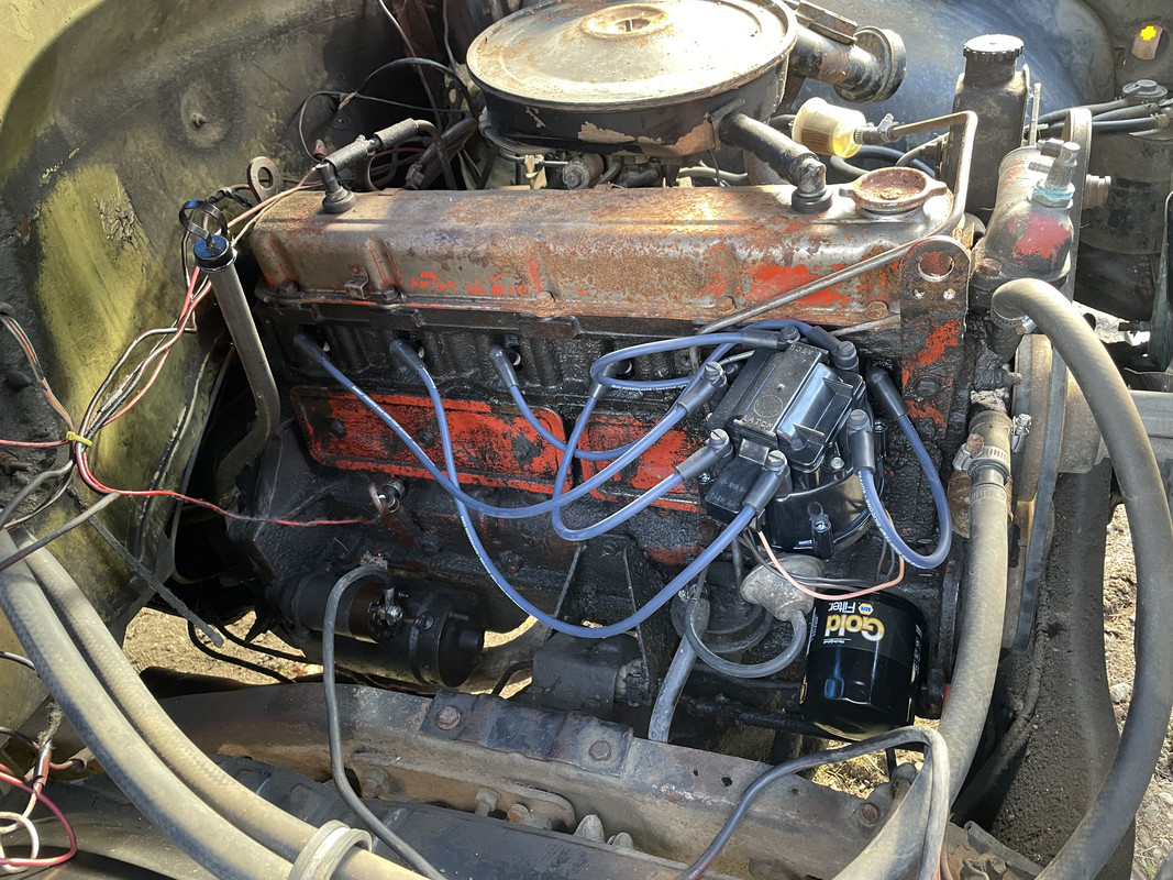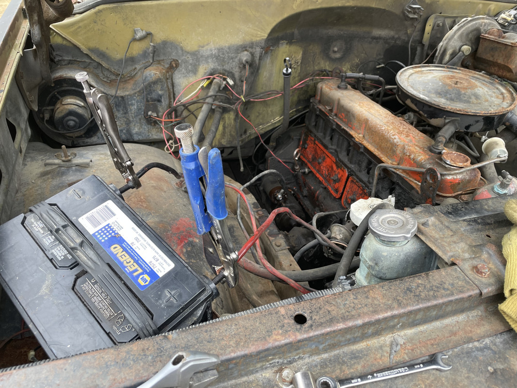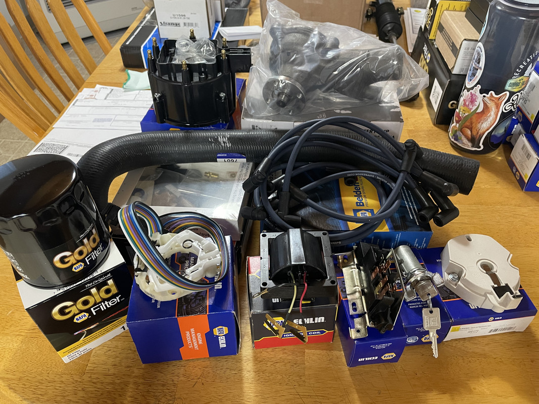 https://i.postimg.cc/hPngmKpx/IMG-8432.jpg Also tinkered on the engine a bit. It was gently seized, but I tightened the belts and let it soak with a mix of ATF and diesel in the cylinders for about 30 minutes, and rocked the fan back and forth until it turned. https://i.postimg.cc/g0xPpj29/IMG-8436.jpg Added battery power, and jumped the solenoid with a screwdriver, and it cranks over really well! https://i.postimg.cc/1znbTdvs/IMG-8437.jpg Picked up some basic parts to get things started. Oil and filter, plugs, wires, cap, rotor, ignition coil, carb rebuild kit, waterpump, upper radiator hose, turn signal switch, ignition slider switch, and key switch. https://i.postimg.cc/SKBHpGP8/IMG-8441.jpg |