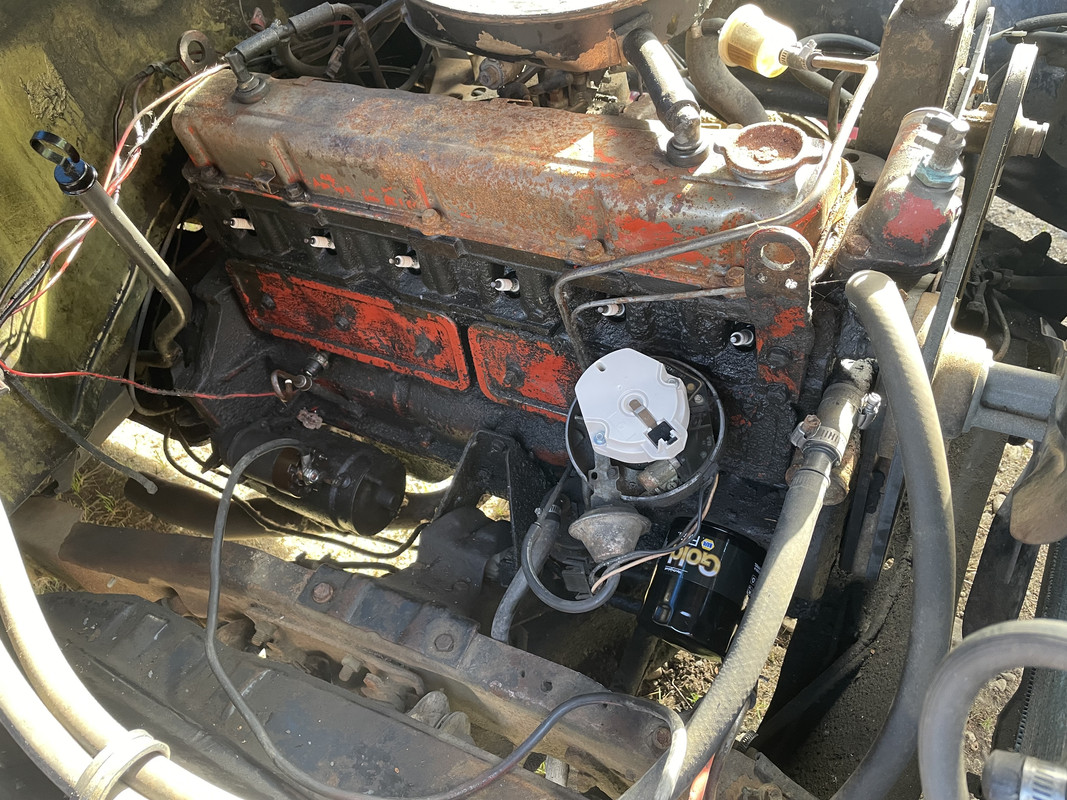 https://i.postimg.cc/vBfYNkG4/IMG-8525.jpg I did a quick wiring job to put power to the distributor, and she fired right up and idled! https://i.postimg.cc/HnmYDzLB/IMG-8526.jpg |