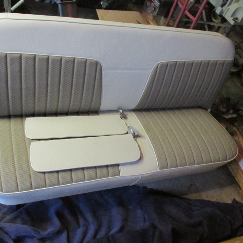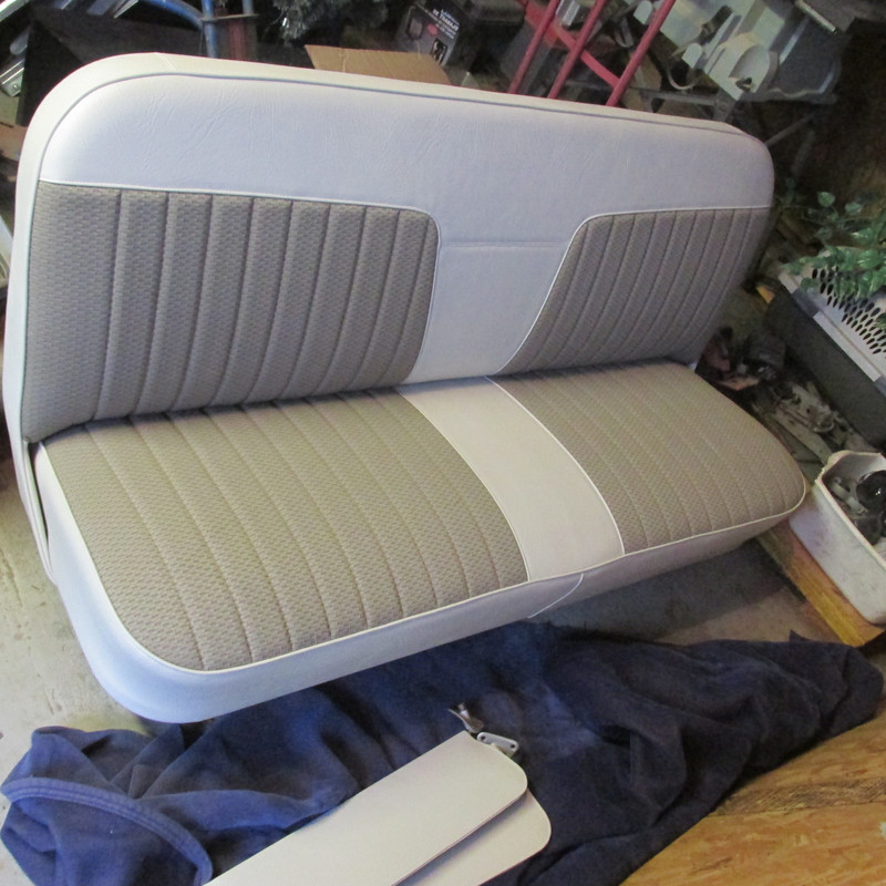 I was able to get the engine out and have been busy getting it cleaned up and painted. I picked up the seat and from the upholstery shop. I'm very pleased with the results. The vinyl is original to 1964 Chevelles but the cloth is from 2009 Ford F150 pickups. Now to get the engine back in and running. then on to the interior.