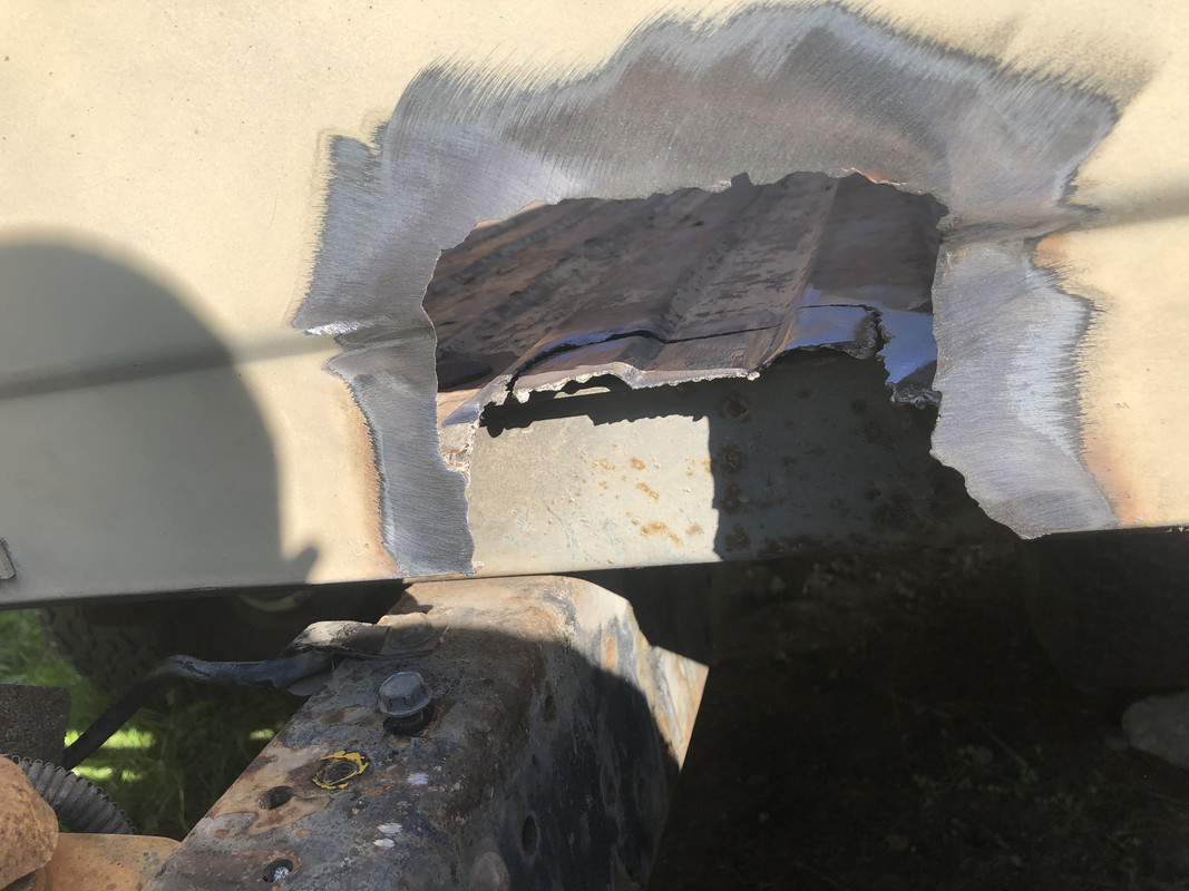 Since the biggest portion of this project is looming near (swapping the cab over), I decided to use this weekend to repair the hole cut in the bed, since I won’t be able to access it once the cab is on. Started out by bending some metal as filler pieces. ![]() The hole I’m dealing with. ![]() Cleaned up the area. ![]() Cutout traced. ![]() Old material cut out. ![]() Started on the inside piece due to easier access from the front. ![]() ![]() Front piece welded in! ![]() Cleaning up the welds. ![]() Applied some primer. ![]() Not completely perfect, but far better than what was there! ![]() Also bolted the last of the accessories to the engine, the fan, dipstick, and motor mounts. ![]() Finally got around to painting the transmission as well! Primer applied ![]() Paint applied! ![]() ![]() And tape off! ![]()