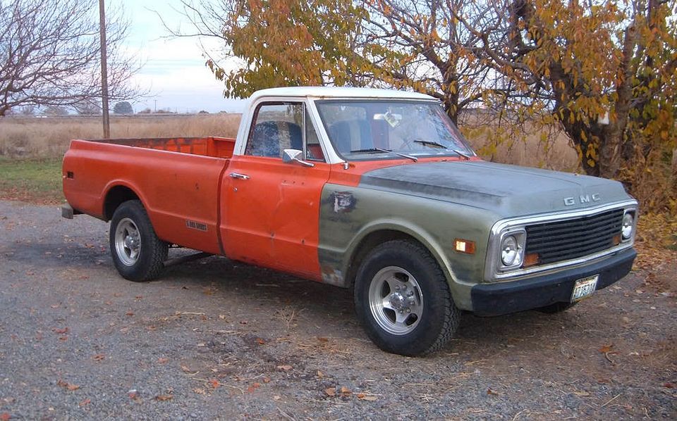 My 71 GMC has kinda of patina on the still orange part in that the paint showed it's age but didn't have a bunch of rust. The nose was after my aunt wrecked the truck and the only affordable nose I could find was one off a 70 Chevy including painted bumper. I had primered it black when I put it on but the primer had faded after a while. This was just after I put the wheels on it and had it cleaned up a bit.
