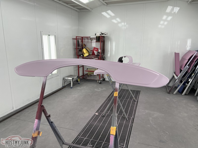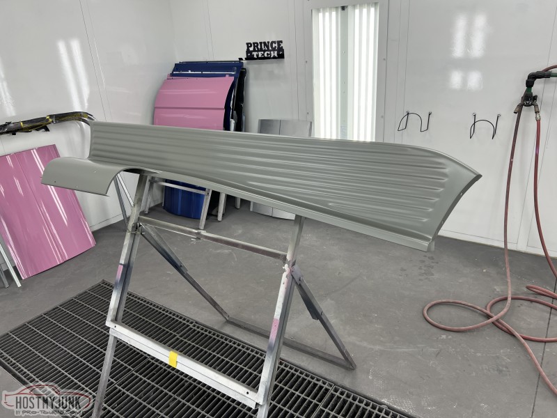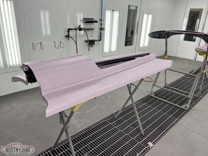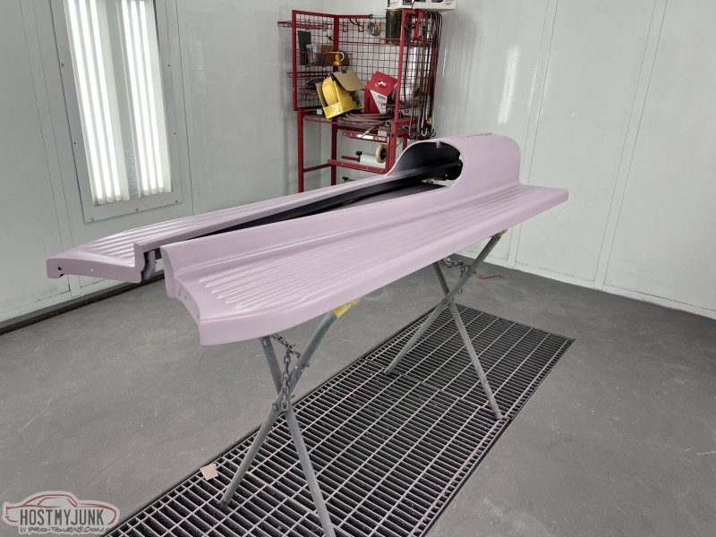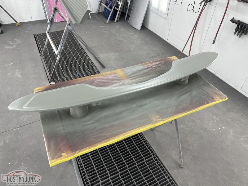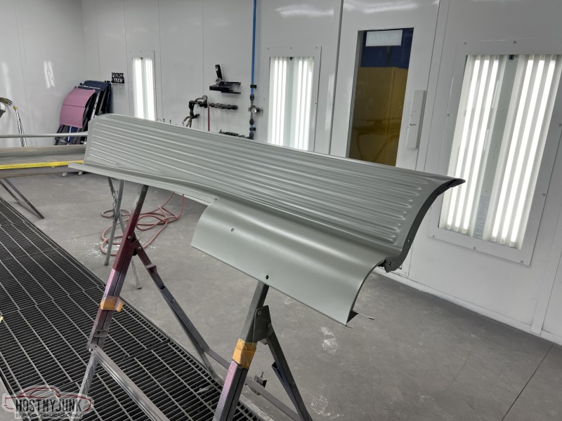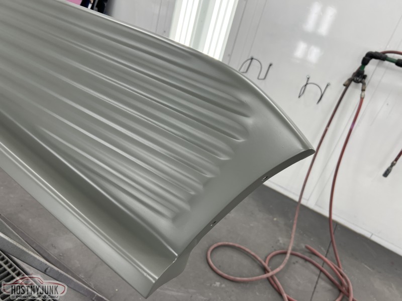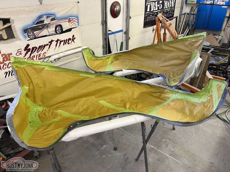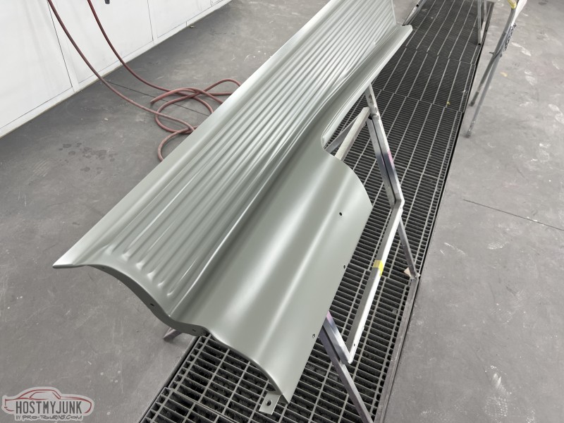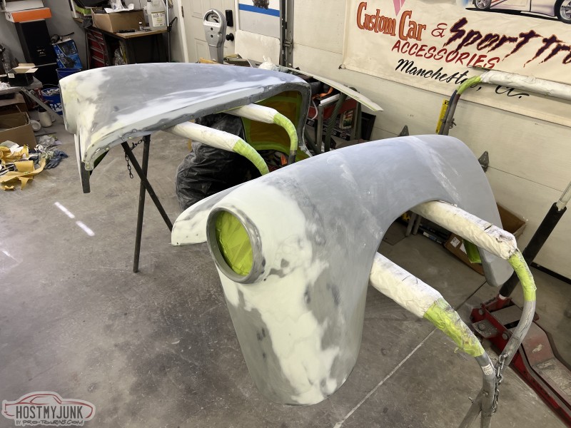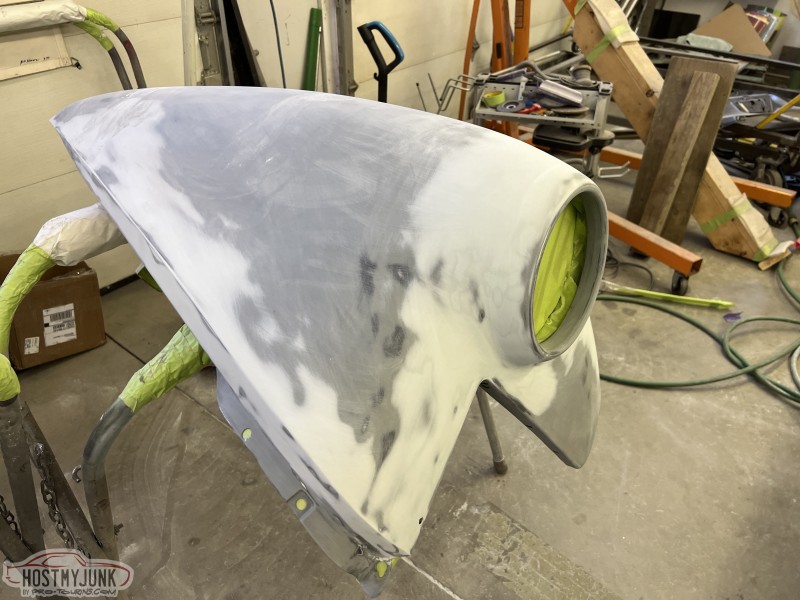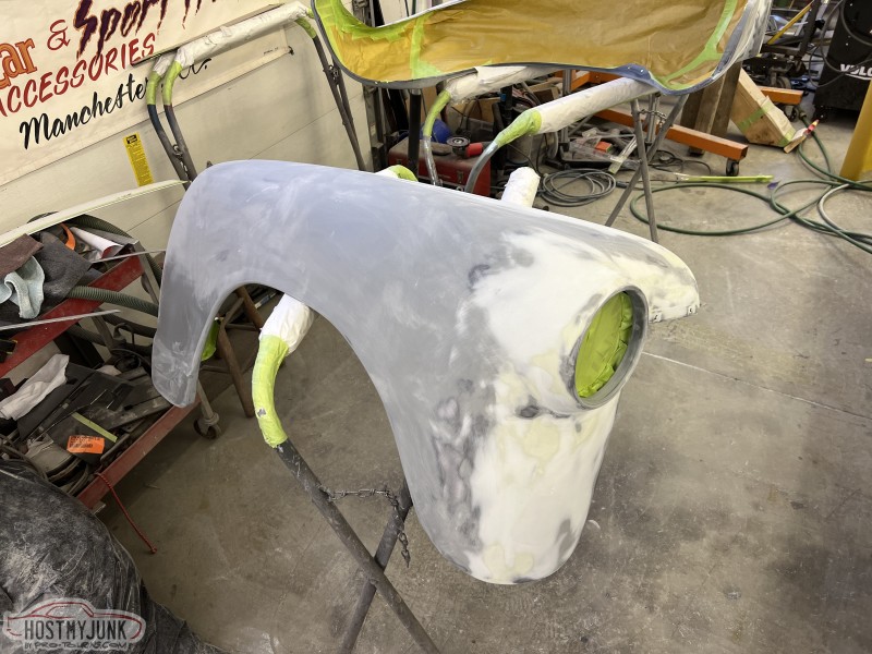 I brought the front fenders to work and today I was able to get them in the booth for a few coats of Evercoat Optex polyester primer. I will let these cure and shrink up until next week some time and then start blocking them.