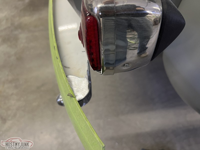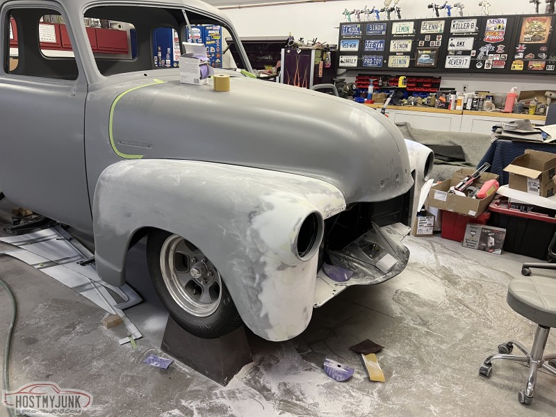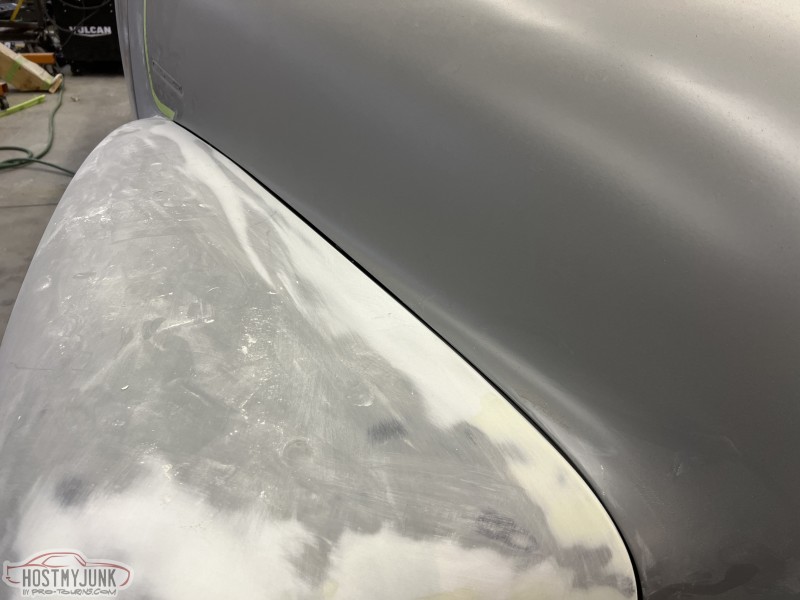 The last few days have been working the front fenders. I block sanded the primer and then started the body filler work around the headlight rings and the fender/hood gap area.