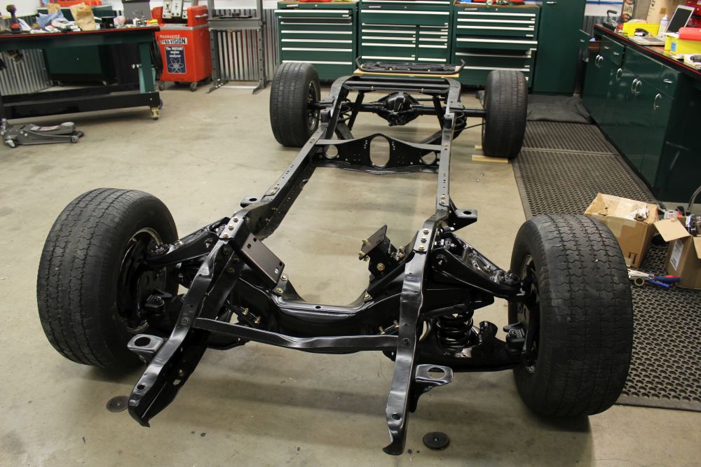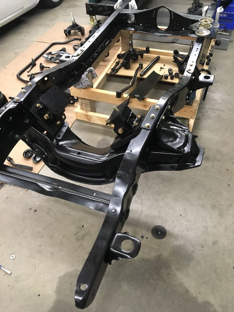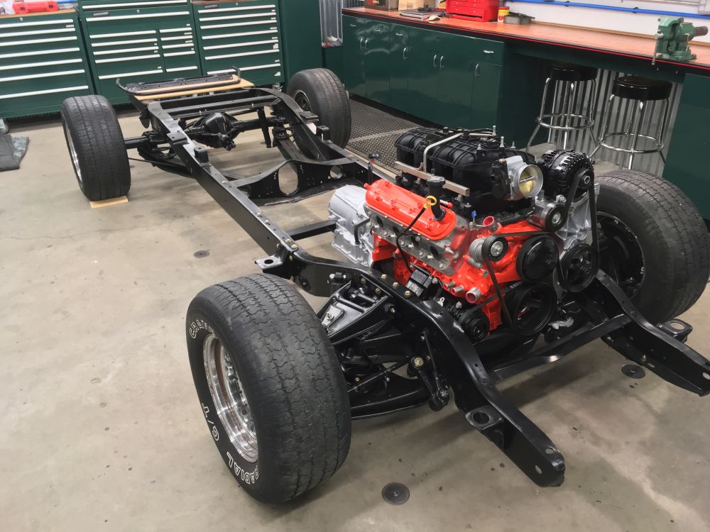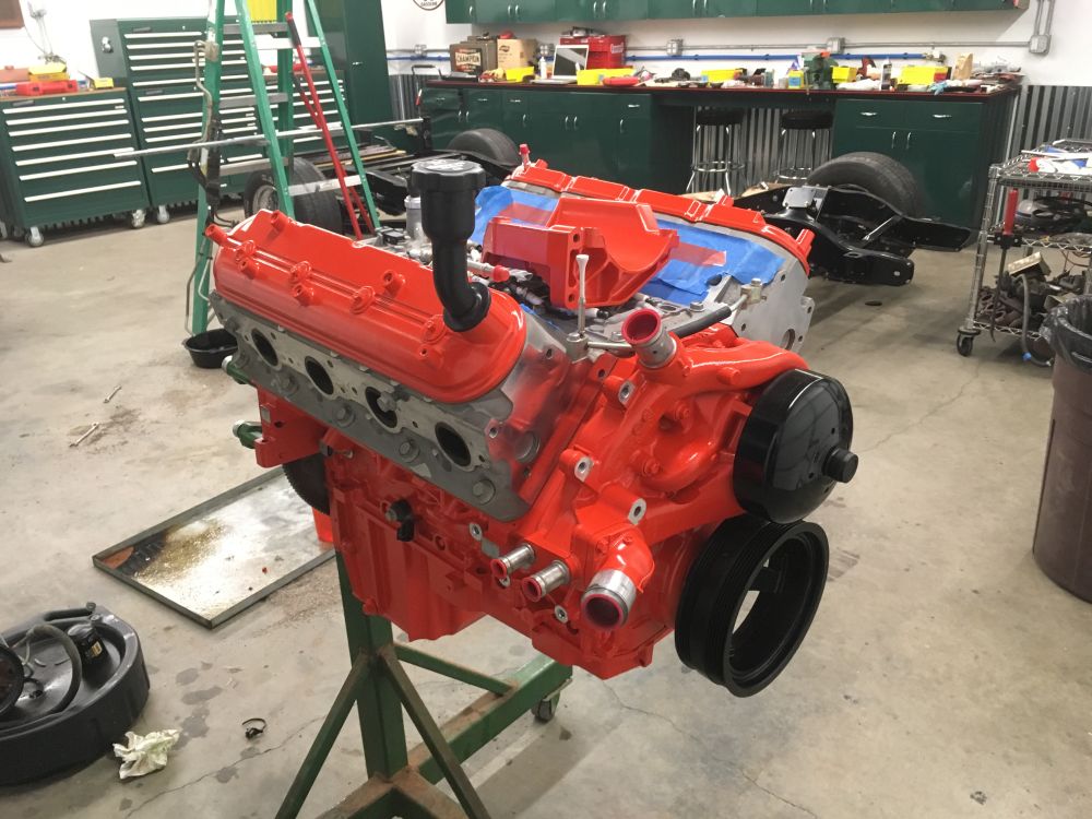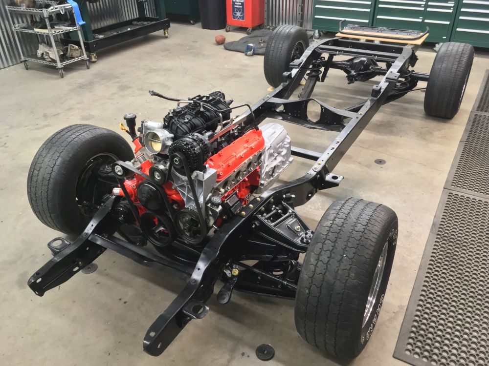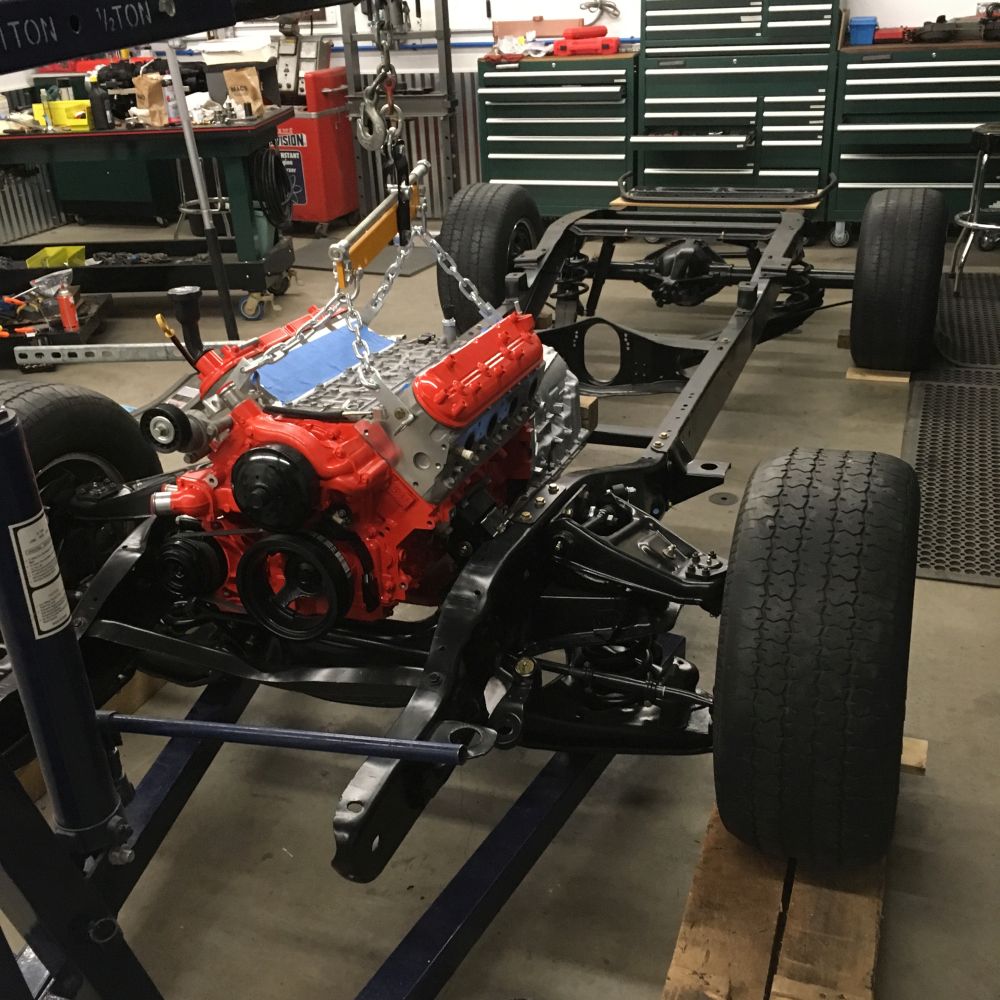 Back again with another update. I have since gotten the rearend bolted in, rear brakes done, front suspension put together, and the whole frame back on wheels for the first time in a long time for this project. I actually had the frame on wheels a week ahead of my goal so I'm track so far. Two weekends ago I disassembled the 5.3 and prepped/painted it. I think it really cleaned up good. Last weekend was spent cleaning up and painting other odds and ends. This past Wednesday night my dad and I pulled the midnight shift and got the engine and transmission mated again and setting on the frame mounts. Friday, I was able to the transmission and engine centered and set and every thing buttoned up. Now I just need to get some sheetmetal ordered up.