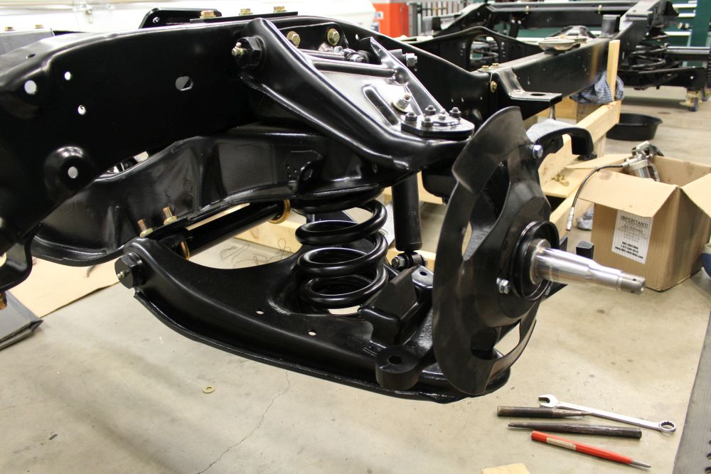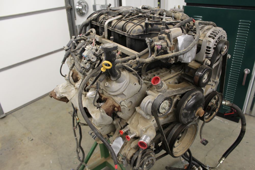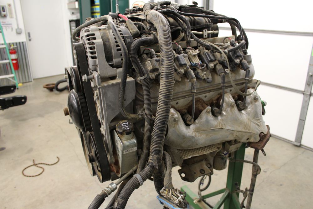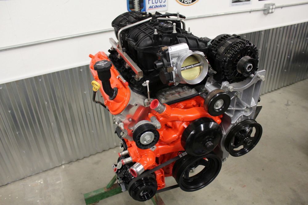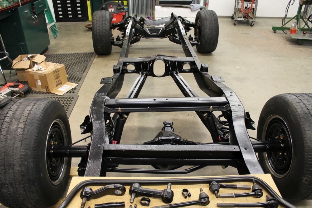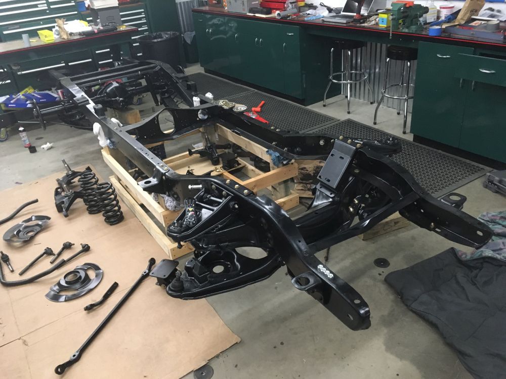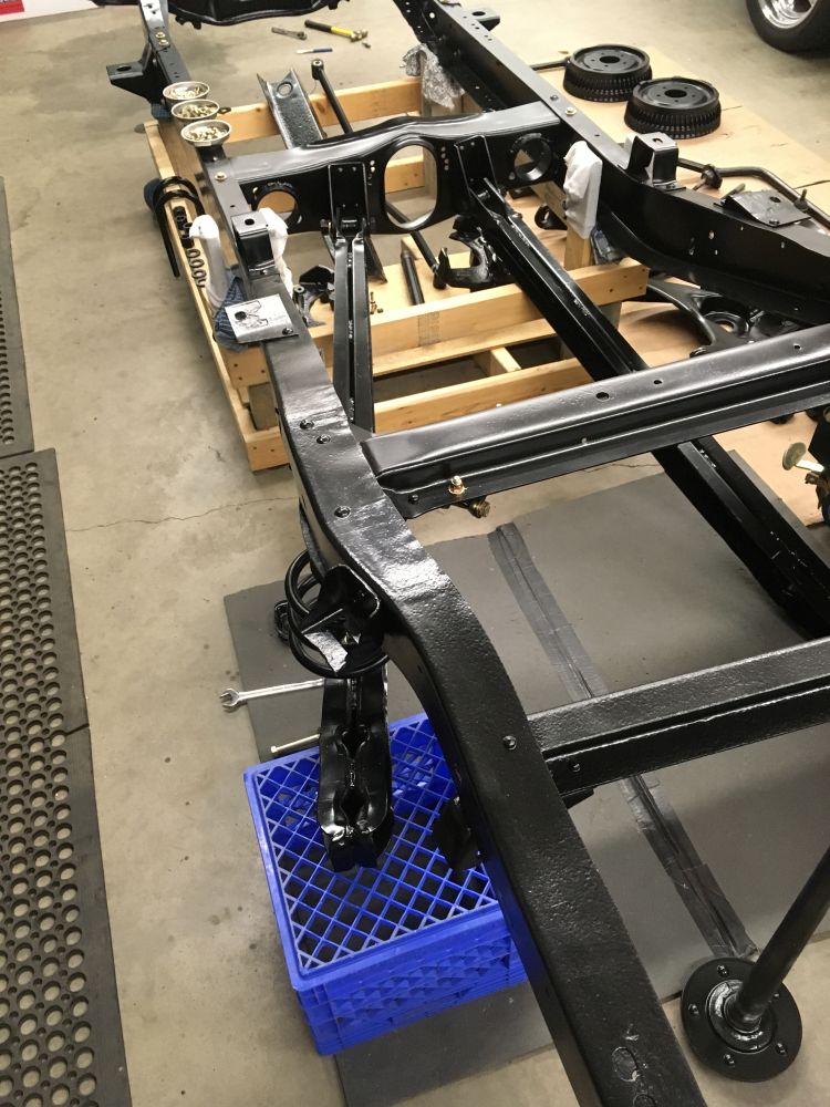 Back again with another update. I have since gotten the rearend bolted in, rear brakes done, front suspension put together, and the whole frame back on wheels for the first time in a long time for this project. I actually had the frame on wheels a week ahead of my goal so I'm track so far. Two weekends ago I disassembled the 5.3 and prepped/painted it. I think it really cleaned up good. Last weekend was spent cleaning up and painting other odds and ends. This past Wednesday night my dad and I pulled the midnight shift and got the engine and transmission mated again and setting on the frame mounts. Friday, I was able to the transmission and engine centered and set and every thing buttoned up. Now I just need to get some sheetmetal ordered up.