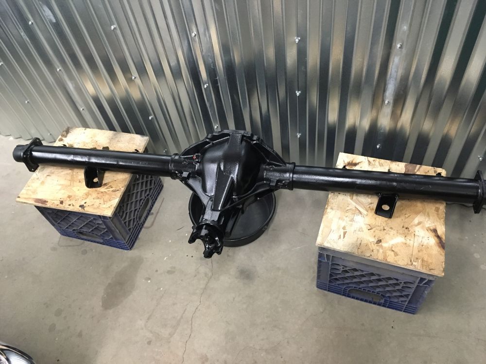 I think there is some unwritten rule about showing the box pile so here it is. Contents Include: -4"/6" Drop Kit - 2.5" Spindles, 1.5" Front Springs, 6" Rear Springs, -Front/Rear Shocks -Shock Relocator Kit -Super Track Bar -LS Engine Mounts -Lower A-Arm U-Bolts -Swaybar bushing set w/ lowered brackets -Trailing Arm Bushings -Weld-on axle saddles -ECE Transmission Crossmember -Coil Spring Retainer Kit This stuff was all packaged very nicely into those boxes and everything was well wrapped. I thought for sure that a few boxes were missing or coming later, but it was packed into those. For anyone that has sandblasted their own parts, I'm sure you will agree with me that any future projects will be taken to somebody. I bought this pot blaster 10 years ago when I started this thing, and hadn't used it until I started this truck. It works really good, when a person is blasting. Most of the time is spent not blasting though. Time is spent setting up a catch area if you plan on reusing your media. You've got to sweep up and collect your media. You have to screen it all before you put it back in the blaster. Add in breaks for your air compressor and so forth, and you've got a lot of time wondering why you didn't hire it out. I set up this blasting "horseshoe" four times in the last couple of months and every time I do, I dread it. It works good for recollecting the media, but it is a very slow process if you are not setup for it regularly. The weeekend prior to this past one, I blasted the trailing arms I picked up the week prior, the rear most crossmember, my front cab mount brackets, center link, rear brake drums, my '72 leaf spring rear end after grinding off all of the brackets, and the ends of the axles. The trailing arms I picked up were in really good shape. Probably about the best possible condition you'll find them in this state anyways. Every set I've seen have gotten small rocks wedged between the two rails and they keep collecting inside and spreading the rails further apart. These had only a slight gap but I wanted to clean them out anyways. So they were split apart and then rebolted back together after blasting, followed up by a few stitch welds on the top and bottom. Thursday night I was able to get some paint on them and my other blasted pieces. You don't realize until you're running a brush on these arms, but there is a ton of surface area to cover, they must have take 20-30 mins each. Also blasted and painted this high hump cover I picked up for $15 at the same place I picked up the trailing arms for $75 each. Pretty happy with that find. Here's the leaf spring rear end that came out the truck in the original post. This one has 3.07 gears in it compared to the 3.73's that were in the 6 lug rear I was going to use. I'm not sure how well it's going to work with the 6l80, but I guess we'll see. So after talking with Stan at ECE, he didn't seem to recall of having to shim rear ends for the normal drops that they offer, so I decided to match the pinion angle of the other rear end I had. I used some steel tubing and a variety of shims to set up a level work platform. I placed the factory coil spring rear end on it and took a bunch of reference measurements. Then I placed my blasted housing on the saddles, and after a couple hours of measuring, rechecking, and measuring again I placed a few tack welds on, and checked a few times more. Once I was sure it was where it needed to be, I welded the new saddles on, stitching about an inch at a time alternating between sides and letting it cool down some. Slapped some paint on it Saturday and a few other parts and we're good to go. I didn't get much time yesterday to work on the truck, but at least now, the big stuff is out of the way, and I can get some work done. I mounted most of the misc. small brackets and loosely installed the trailing arms after putting the new bushings in. Put the LS engine mounts on as well.