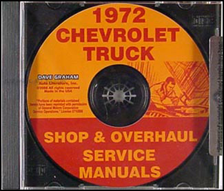 This CD-ROM offers page-for-page reproductions of two bound manuals that Chevrolet mechanics used to service vehicles. It includes the 482 page "1972 Series 10 through 30 Chevrolet Truck Chassis Service Manual" and the 489 page "1972 Chassis Overhaul Manual." In the service manual you will find detailed service procedures for lubrication, frame, shock absorbers, front suspension, rear axle and suspension, brakes, engine, transmission, fuel, exhaust, wheels, tires, chassis-sheet metal, electrical system, heater and air-conditioning. In the overhaul manual you will find step-by-step instructions for tearing down & rebuilding air-conditioner compressor, front axle differential, rear axle differential carrier, engine, carburetors, clutch, transmission, and steering. With the step-by-step illustrated instructions, specifications, and wiring diagrams on this CD, you will have the information you need to get your project on the road and keep it there. You can use the information on this CD to restore all 1972 Chevy 10-30 series pickup, ½-ton through 1-ton truck, Blazer, Suburban, and van. Buy now to own the best manuals for your vehicle on CD. We have manuals on paper also -- see our other items.