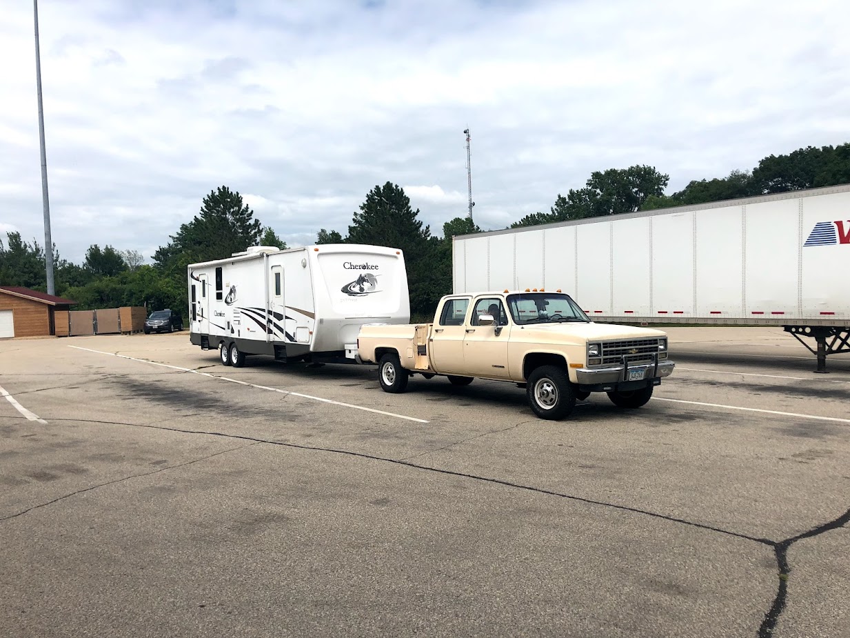 All loaded up, the camper maxes out close to 11,000lbs, and with the truck running around 7,000 we're pretty much right at the 18,000lb limit these "light duty" trucks can handle. I gotta say, even with the shiny new 383 stroker it was definitely struggling a bit going up and down some of the steeper hills, like the 6% grades in and around the Dubuque area. At one or two points along the journey, she had to grab 2nd gear and labor uphill at around 45-50mph and 3200-3500rpms. Most of the rest of the way though was spent in 3rd, in and out of lockup (maybe 90% in and 10% out) and cruising along at the speed limit. I was also getting somewhere around 6-8mpg. Really, not too bad in my book!