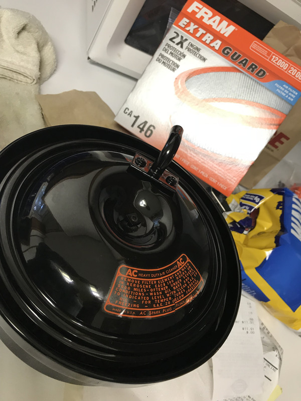 https://talk.classicparts.com/thread...-filter.13733/ Used a CA146 FRAM filter. It was cheep. The K&N is P/N:E-1000 The filter did seal on the bottom, but the surface is slanted. If you could weld or epoxy a flat surface to the bottom sealing surface you would have a nice setup. I love the oil bath. I am a fan of the oil bath myself. But after lots and lots of hear say I did the research. Found out that GM switch due to they had engine life increase after just swapping a paper filter in the oil baths place. Later on they figured out paper was in fact cleaner. Oil bath is great but it is not the best! GM also found that engine life was greater after running the PCV air intake to the air cleaner, this increased engine life by 40% as opposed to the valve cover air intake. I went threw a lot of old books and lots of searching to find this info. Now, if you ask anyone that has a oil bath what is better, they will insist on oil bath. Oil bath was for the most part better then nothing. The SAE has set standards for air filters and they must clean so good to pass. Oil bath dose not clean dust that well, the idea of oil bath is that it makes a 180 degree bend and slams the air into the oil and then hope the heavier partials would drop into the oil. Oil wetted air filters such as K&N have claim some of the best filtration around, I am currently experimenting with the AEM dry flow filters and also run paper and K&N filters. Last edited by mikebte; 06-15-2018 at 01:15 PM. Reason: Grammer |
