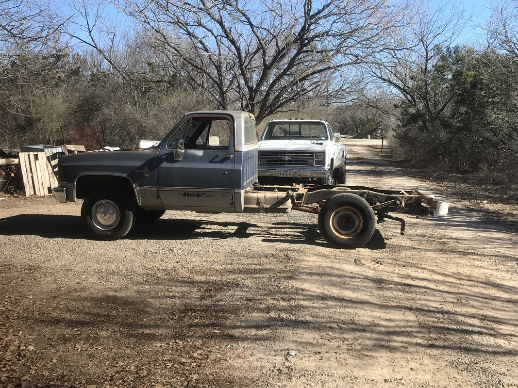 just cut the cab off the old plow truck . it was a 87 2wd solid floor pan style on a 79k30 frame.