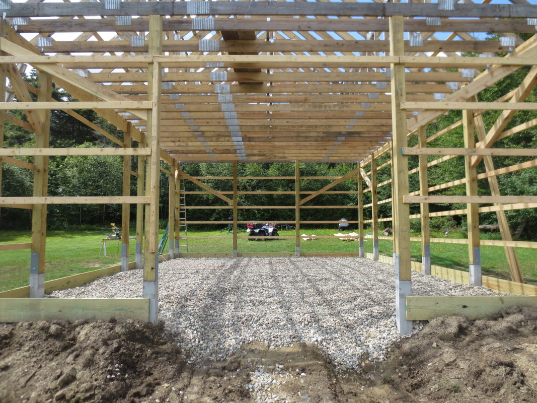 I am no engineer, but I assume you will have it hung to one side closer to the chords as opposed to the middle. I don't think you would have a problem. You did a beautiful job on your pole barn/garage. Very good looking building. 6/12 pitch?