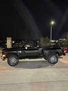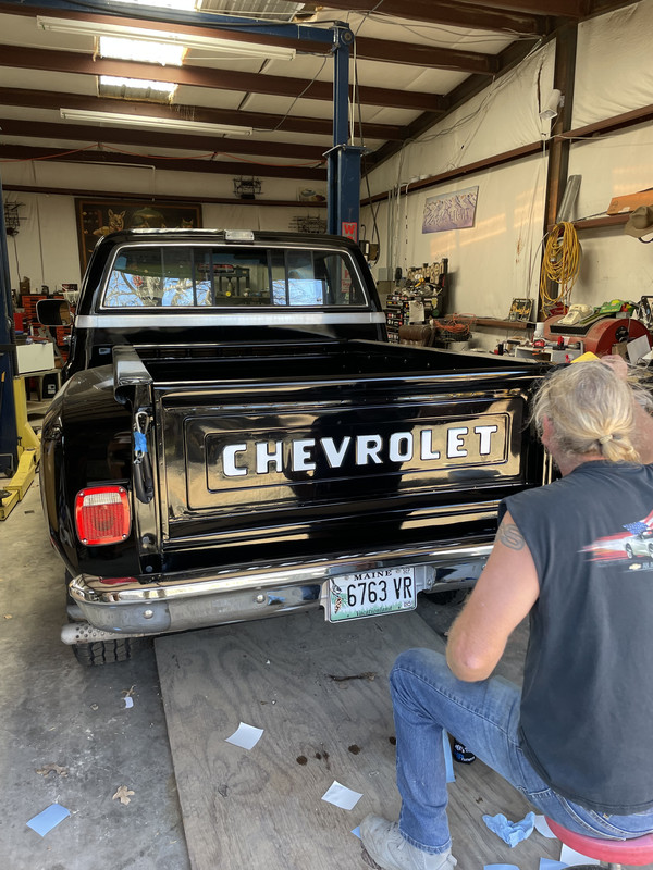 I am wrapping up my 1973 GMC Sierra shortbox and have this rough photo of it just before it went back to the paint shop for final paint last month. I wanted the old school RWL effect as that's what we all did in the 1970's. Was so excited to use all new stock height springs and suspension and found BF Goodrich 33x10.5-15 All Terrains fit right under the stock suspension and on my own new take off 15x8 rally wheels from a new truck I owned in 1985. The truck sets very nice with this combo. Only thing I would add to your stepside is painted white CHEVROLET lettering on the stepside tailgate. lol