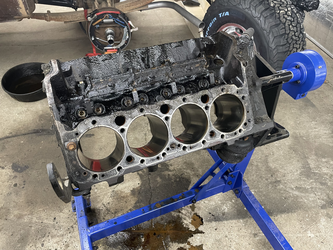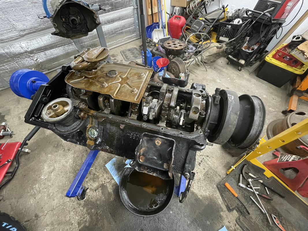 Donor rig was a 2000 Express Van ![]() Engine out! ![]() Engine separated from the transmission and heads removed ![]() ![]() On the stand. Oil was a little milky, so head or intake gaskets were done. ![]() Started teardown ![]() ![]() Completely stripped down. Everything looked serviceable other than some light scoring on the pistons. Off to the machine shop!