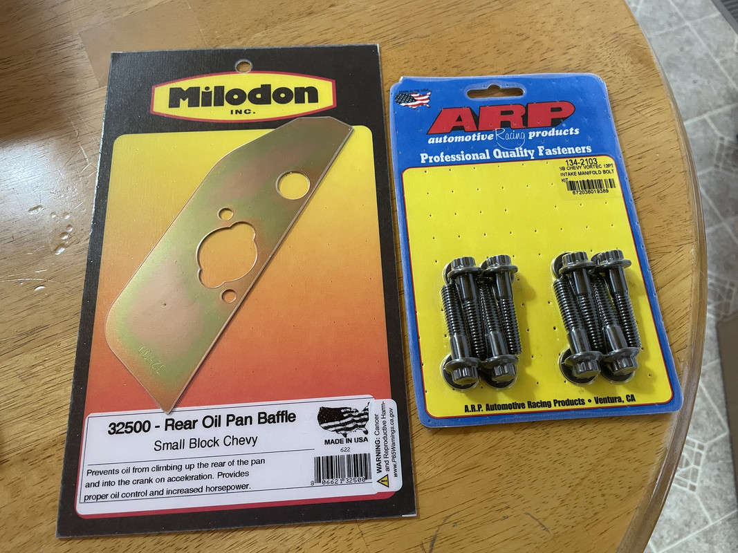 Milodon Anti-climb shelf for the oil pan and ARP Vortec intake bolts ![]() Holley aluminum Vortec timing cover with no sensor hole ![]() Cloyes True Roller single row timing set ![]() Melling M55HV high volume pump and drive shaft ![]() Elgin 1.6 ratio rockers ![]() LS3 beehive springs with Comp retainers ![]() ARP main bolts for 4 bolt main blocks ![]() OEM LS7 lifters ![]() Weiand Vortec carb conversion intake