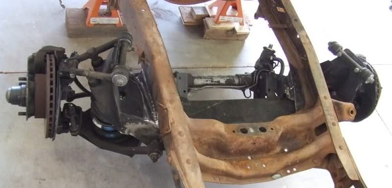 This Jag subframe is soft-mounted with no modifications to the truck frame or the crossmember. It is on airbags, but the ride-height is set to what it would be for an XJ6 (corrected for different tire diameter than the Jag) The XJ6 S3 ride height specification is usually expressed as a distance from the bottom of the crossmember to the ground, and if I recall correctly is about 4.5" for my truck.