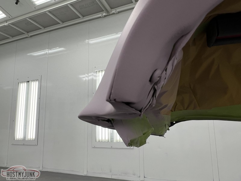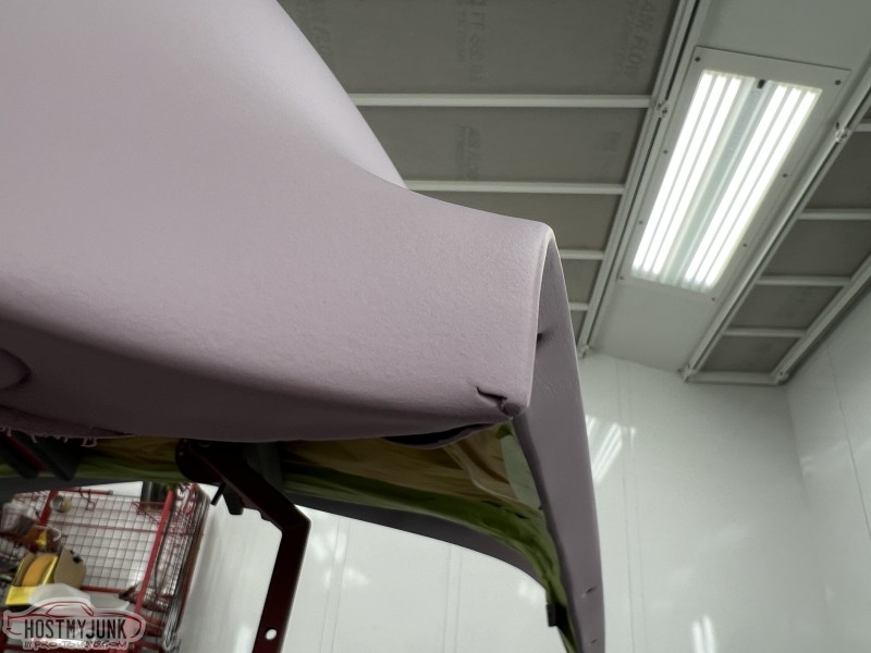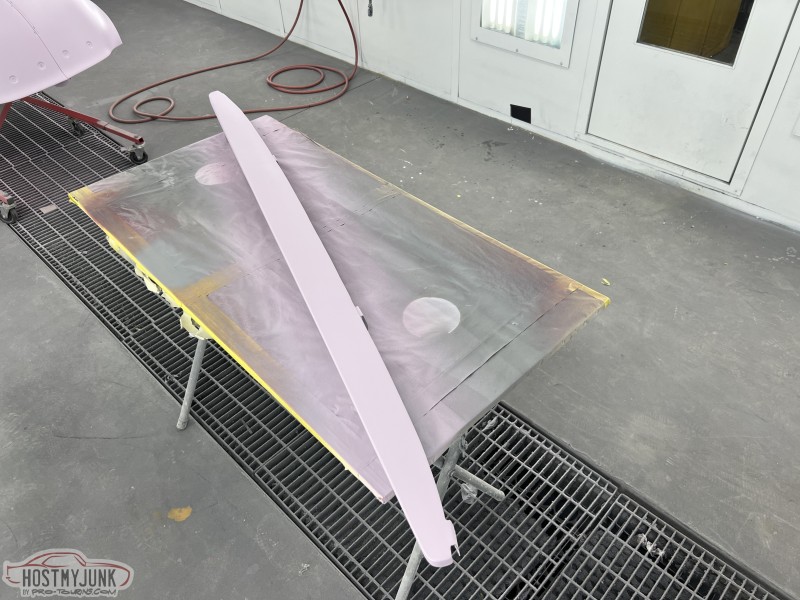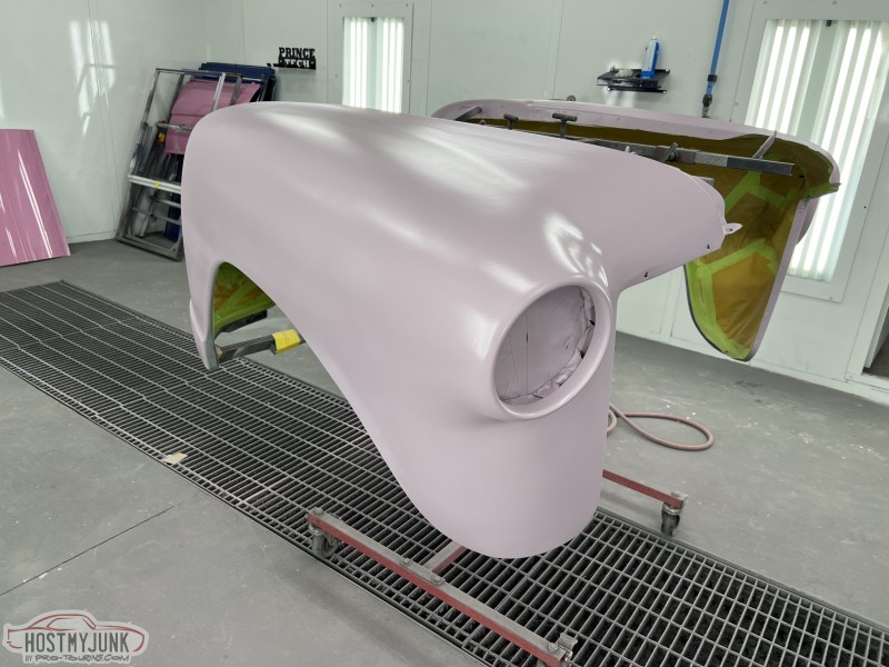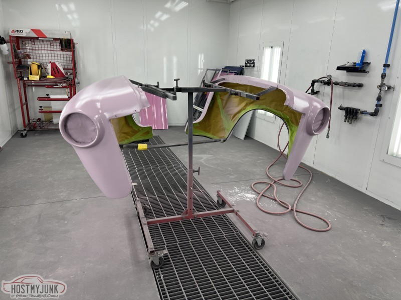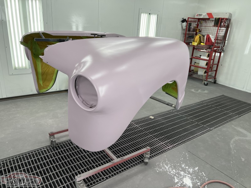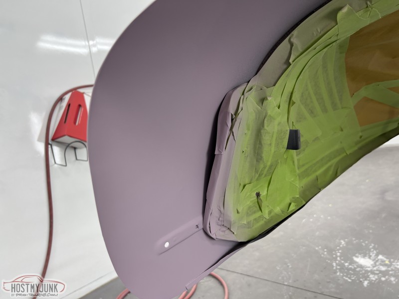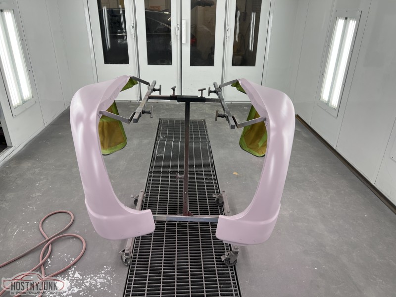 I brought the front fenders to work and today I was able to get them in the booth for a few coats of Evercoat Optex polyester primer. I will let these cure and shrink up until next week some time and then start blocking them.