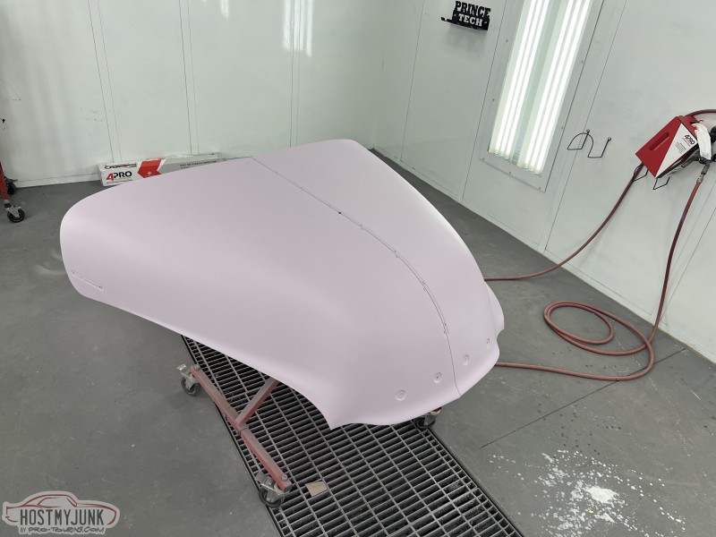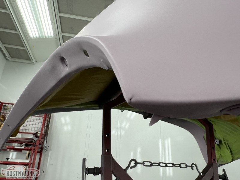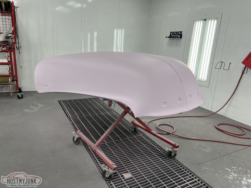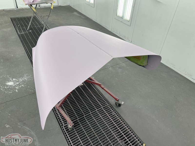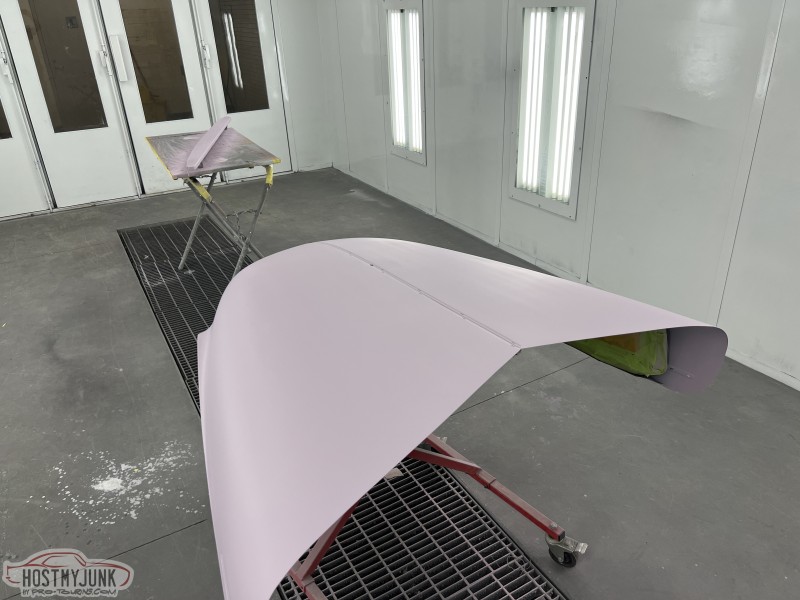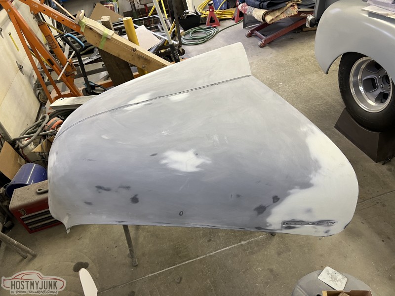 I spent 11 hours last weekend doing bodywork on my hood. I didn't take a lot of pictures, but here it is waiting to go to the booth for poly prime. Just when I thought I was done I flipped it over to mask the underside so I don't get a ton of overspray on the bottom. Thats when I realized that the roughly 1.25" wide flat on the edge of the hood that rolls inward at the fender looked like crap and will toltally be seen with the hood open. So another couple hpurs fixing that and its all now done.