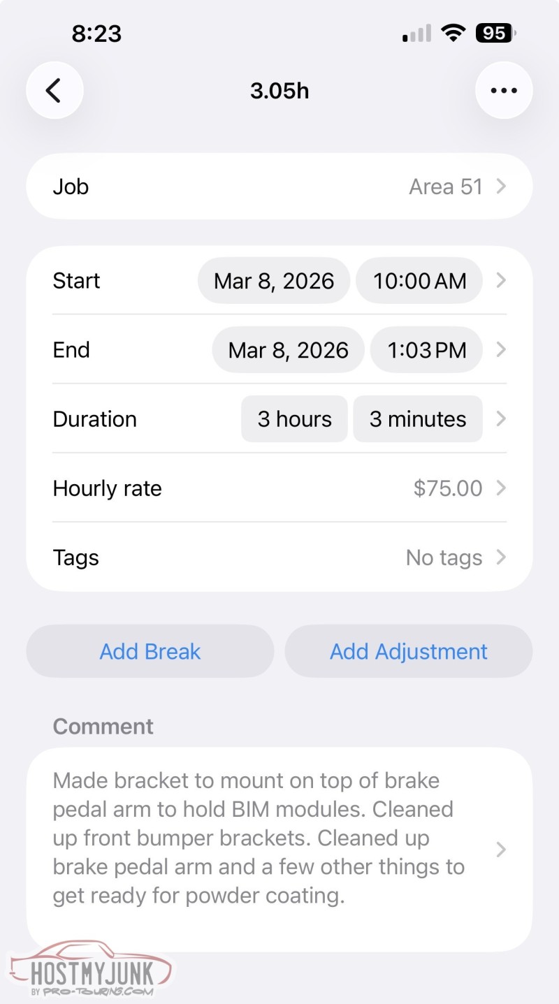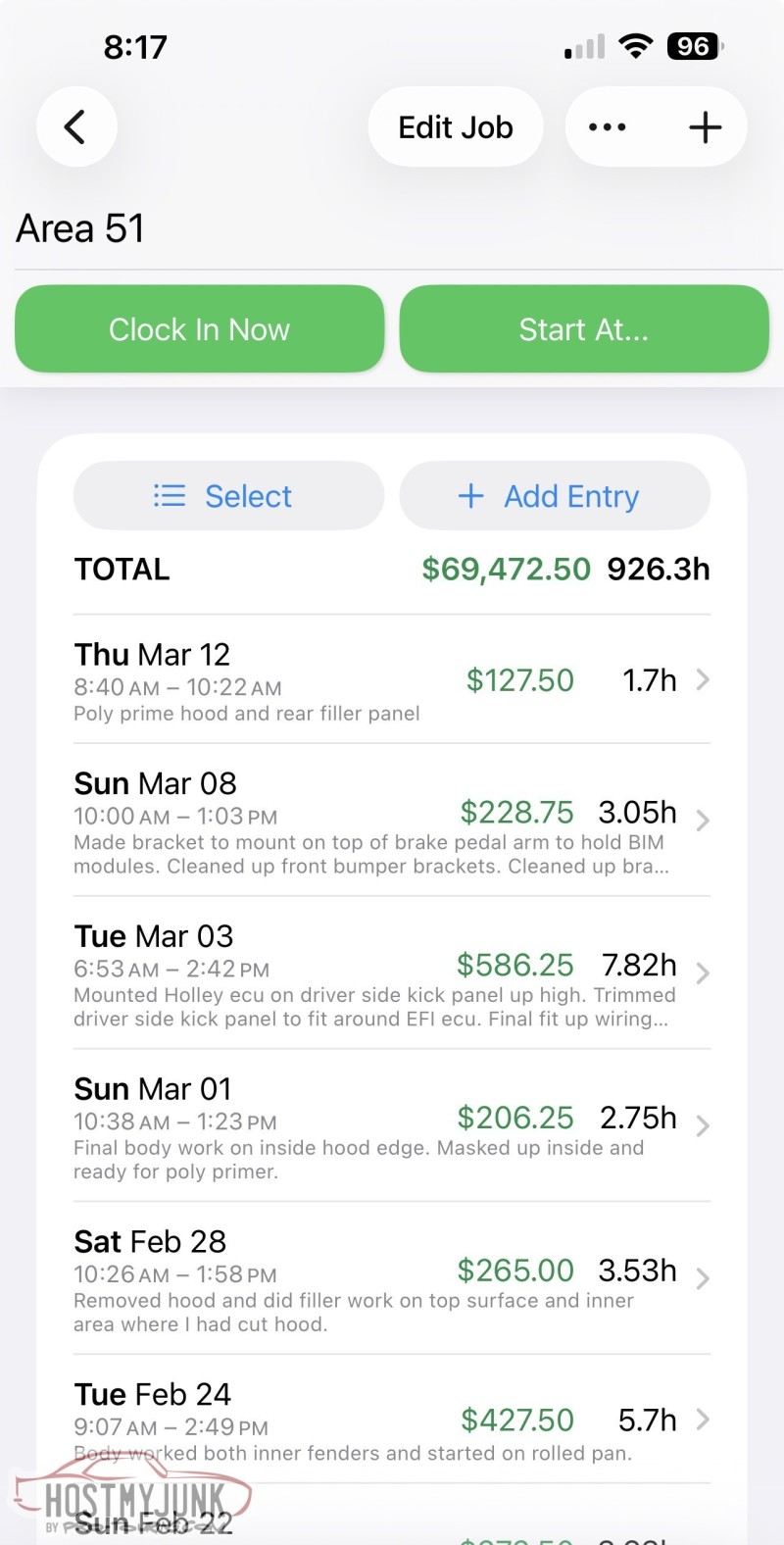 Because I do a fair amount of side work on hot rods for people I needed a good way to track my time that was better than using a pen and pad. I found this app called "Hours Tracker". With this, I can create a job, name it, give it an hourly rate. Then punch in and out to the minute. Give each time stamp a comment on what was done during that time period. I can also export it to an email that creates a bill for a customer. ![]() Here is the job for my truck, I call Area51 with all time stamps so far. Now I obviously am not charging myself, but if I were paying someone to build this truck this is what it would co$t. ![]() And here is an actual time stamp from last week. This shows punch in and out, hourly rate, and the note for what I did during that time.