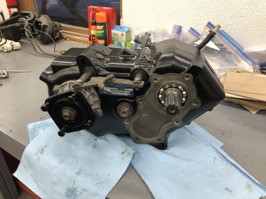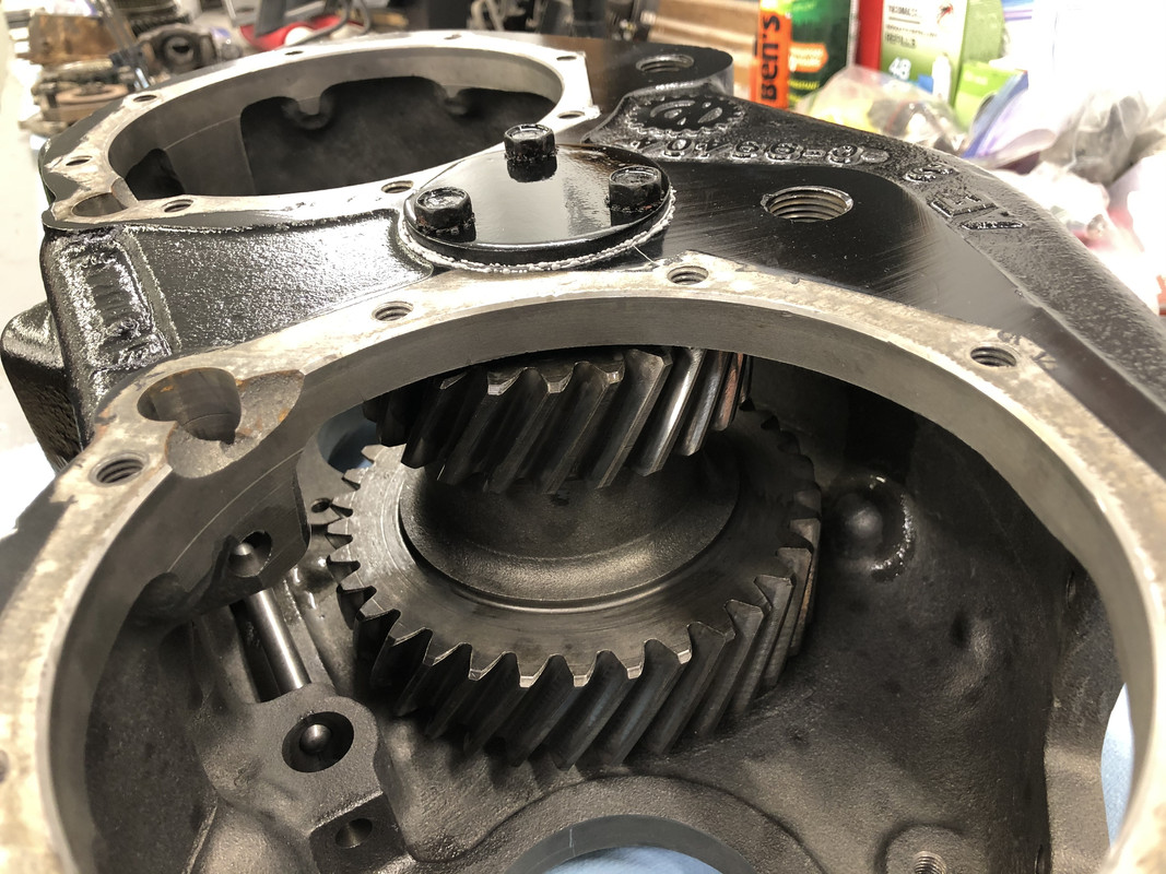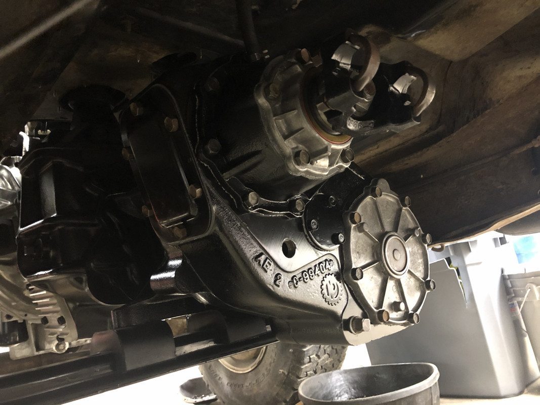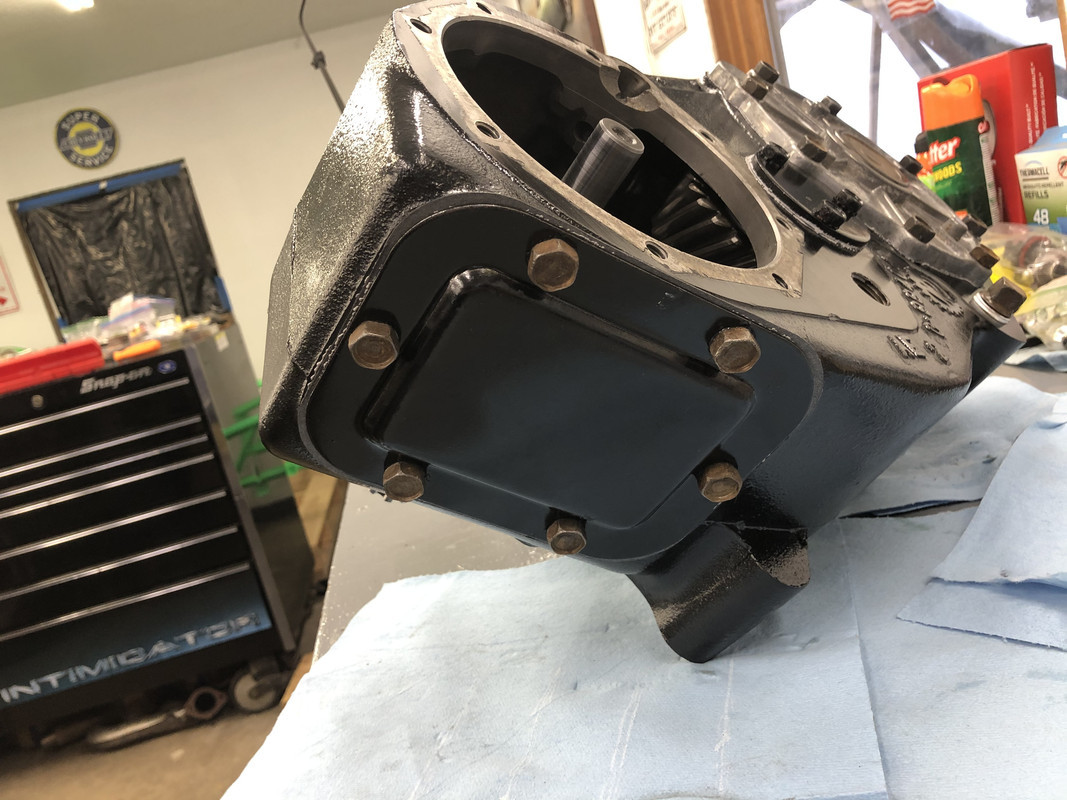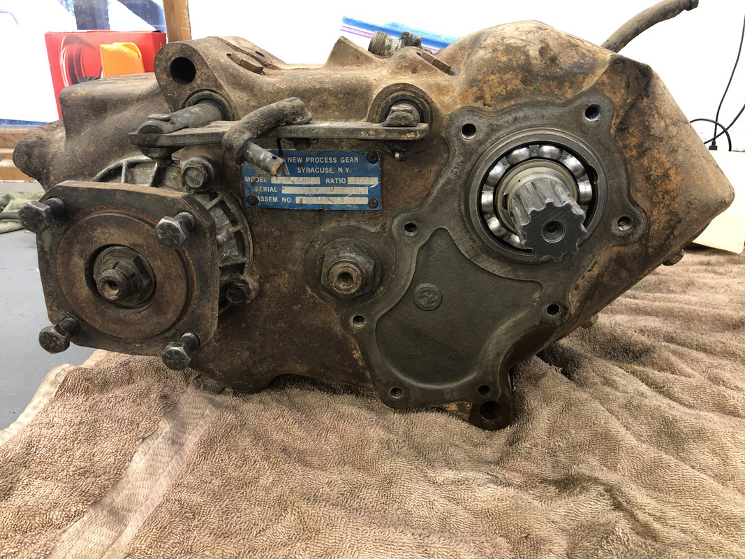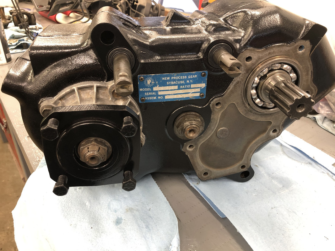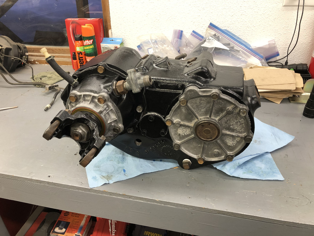 I painted a few more parts overnight. Installed the front output cover and yoke, and the serial tag. ![]() Also installed the PTO cover plate. ![]() Then the rear output gear assembly. ![]() I had to make my own gaskets out of an extra one, because these weren’t included. ![]() Detents and plugs installed! ![]() Installed the rear output extension housing. ![]() Along with the seal housing and speedometer drive components. ![]() Rear output yoke installed! ![]() Shift linkage installed, it’s complete! ![]() Prepping the gasket surfaces with some sealant for install. ![]() About ready to roll this thing into me and bench press it into place! ![]() After a few choice words and a little bit of struggling with turning the input shaft and holding the transfer case from crushing me with just one arm, it’s installed!