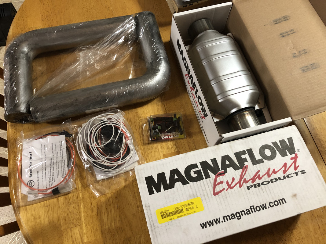 A few more parts showed up later in the day! I ordered a factory stereo off of eBay. These are going for stupid money, untested. This one turns on but unknown beyond that. Time will tell if I bought a $100 paper weight. At least it’ll look pretty! The headlight switch knob and clock knobs both came in as well. I also picked up an assortment of exhaust connectors and adapters from the parts stores.
