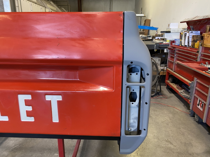 I got both tailgates home and looked them over. The takeoff gate ends up being the nicer of the two. I'm hoping since it was installed on a truck from the factory, it would fit the best. This gate is really nice and straight and doesn't really need much to get it ready for paint. The tailgate handle fits way better than what I had before. After checking the fit, the handle got massaged to better match the lines of the gate. Time to work on the bedside now.