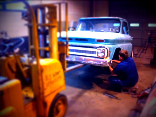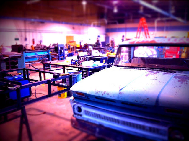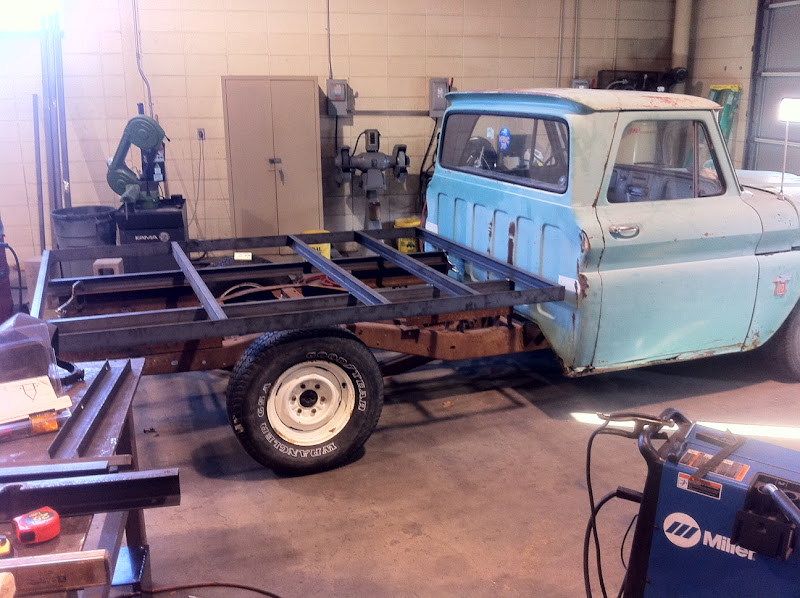 After a bit of advice from you guys and some parts from Jeff at CPP I have the truck down 3/5 and have plans to throw together a flat bed for the time being to get the truck legal and drivable. Couldn't have done it without the local Vo/Tech Teacher and the shop he works in. All the tools you can imagine and some I wouldn't have imagined. I am excited but you guys want pictures the same as I do in a build thread so here they go.