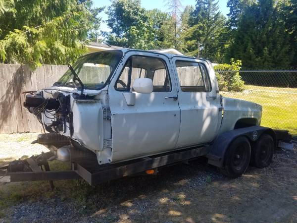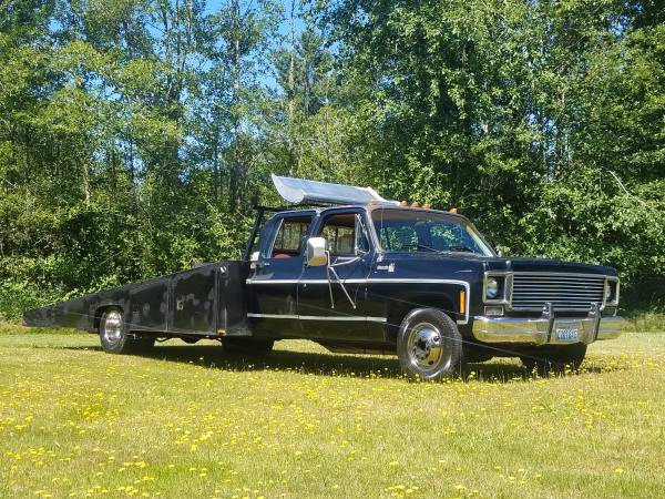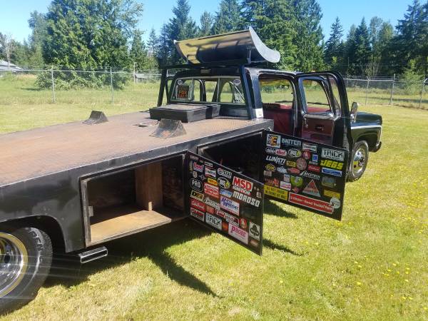 https://seattle.craigslist.org/tac/c...226871908.html 1976 Chevy C30 crew cab ramp truck. Here we go with our badass vintage hauler. Factory black, red interior 76' Silverado with the best looking ramp box ever available. This guy was converted into a ramp truck by Hodges back in the late 70's. The box has 4 big storage compartments, 2 on either side. This truck is almost 31' long with the cheese grader step on the back. It's got a 454 with a TH400 that runs pretty damn good, of course theres always room for improvement. We've used this truck to haul a ton of *****in hotrods so it's proven to do that very well. New custom built headache rack that doubles as a storage rack on top along with being the wing mount. Also just installed a brand new 12,000lb winch with remote under the bed, it works perfectly. Newer batteries, newer tires, newer-ish dual exhaust. The cab and doors are rusty, they can be left alone or.....with the sale comes a really nice, rust free, complete square body crew cab and front clip. Complete doors, both bench seats, steering column, ect. Complete cab also has a clean title. Cab can or cannot go with the truck and price will reflect that. She needs tinkering here and there, but overall you can start using it right away.