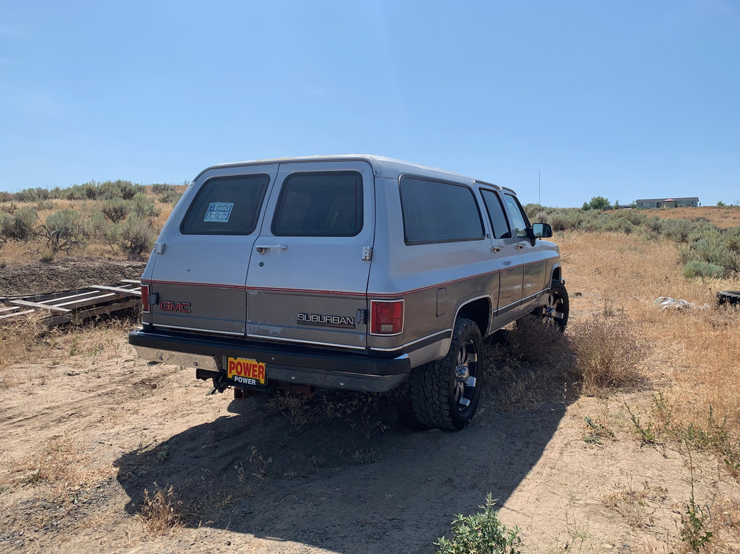 About 8 years ago my wife wanted to get me a Suburban and she found one and traded her mini-van for it. However it was a 90 2wd with a 454. I hated to get rid of it, but it just was not what I wanted and the mileage out of the 454 was terrible. Well, I went in search of my dream Suburban. I wanted a 4wd, 5.7L and it had to be a 3/4 ton so I can tow my travel trailer. I found it, but it was in another state. It was down in Salem Or, about 4 hours away. It is a 90 GMC, 3/4 ton, 5.7, SLE with everything I wanted, tow package, 4:10's, LSD, front and rear A/C, power everything even the mirrors. The problem was I had the cash, but no way to go look at it or go get it. My wife was out of town and I just did not have the time to take off and go see it. So, looking at the pictures only from the web, I bought it without ever going to see it. The dealer agreed to deliver it to me and collect the cash when they got here. It is a big dealer in the Salem area I have dealt with before. It arrived today and I have now had a chance to inspect it and I am super happy with it. Under the hood is a new GM crate engine with all the sticker and new motor mounts. They also replaced the hoses and belts, and all the ignition wires, cap and rotor along with the ign control unit. (the old ones were in the center console) It also has a new radiator, new battery, new starter, new master cylinder, booster and new calipers. I have not pulled the rear wheels, but suspect the rear brakes were done also. A new Hayden trans cooler is behind the grill too. I also looked at the transmission and it was also replaced, it is painted grey like from a rebuilder. Mechanically this thing is in great shape. The interior is also in great shape, but has a minor crack in the dash and a small seam that is separating on the passenger seat. I think I can get that fixed easily. The headliner however is falling in the front and the rear half is gone. Now the bad. The paint is poo, pealing on the hood, missing on the roof and just bad on the rest. There is a dent in the left rear quarter, not bad, but needs fixing. The RF windows kind of works, it goes real slow and needs help to fully close. Got to fix that soon. The A/C does not work and the heater core is disconnected, I assume it leaks. The exhaust is, well a mess. The stock Y pipe is there, then it goes to a piece of flex tube, then a new Cat and short pipe then a new Flowmaster dual outlet. But, that is the end of it, nothing after the muffler. The rest of the issues are all minor, left channel of the radio does not work, door pins need replacing, window seals/wipers are dry rotted. Oh, and the Elephant in the room, those ugly rims. 20in rims and tires. They will find a new home and be replaced with stock steelies and stock dog dish hub caps. Then the 20's with be sold to someone that likes them more than I do. All in all, I am very happy with it. All this for $4300 delivered. Must have cost $75 in gas. ![]() ![]() ![]() Last one is from the dealer I got it from.