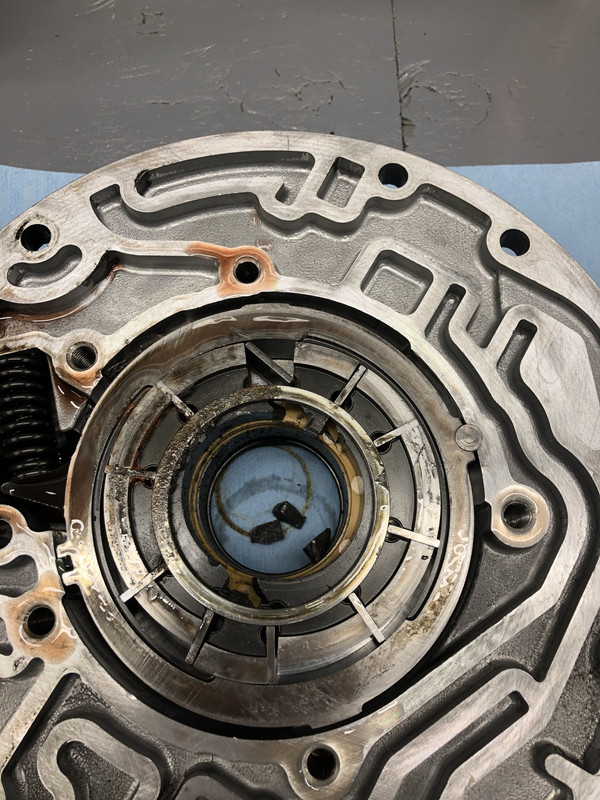 I ended up discovering this damaged pump during disassembly, which I believe is the cause of failure. Most likely it was damaged upon installation from an improperly installed torque converter.